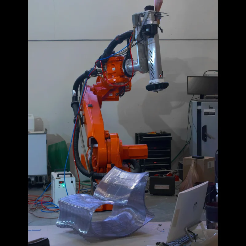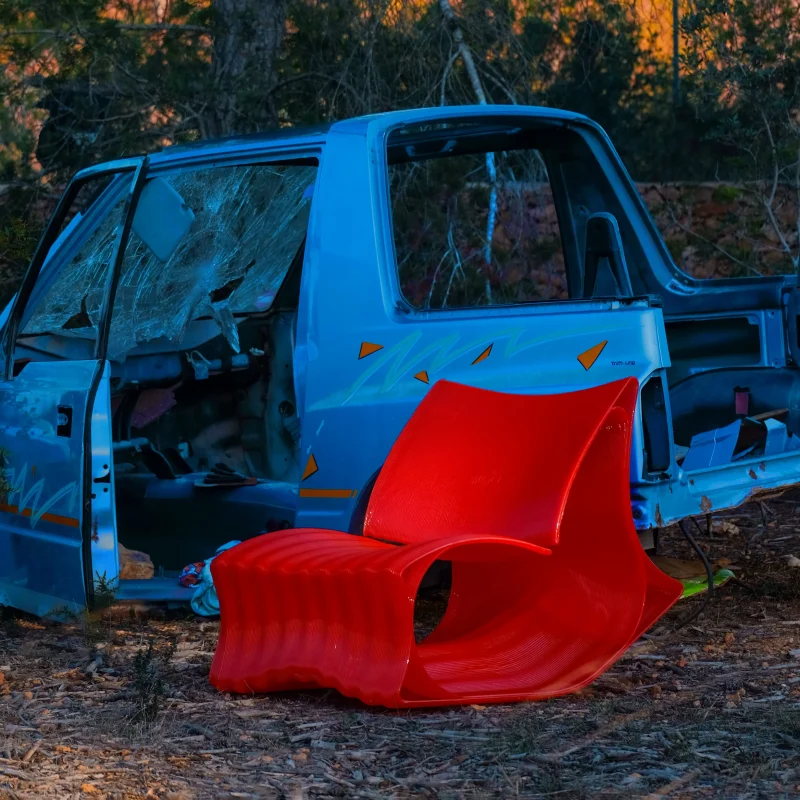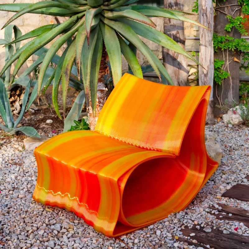 Produced using 3D-printed PET-G, the same plastic found in bottles adapted for digital manufacturing, S·3D minimizes waste and maximizes efficiency. Its lightweight yet sturdy structure makes it ideal for both minimalist interiors and more experimental spaces.