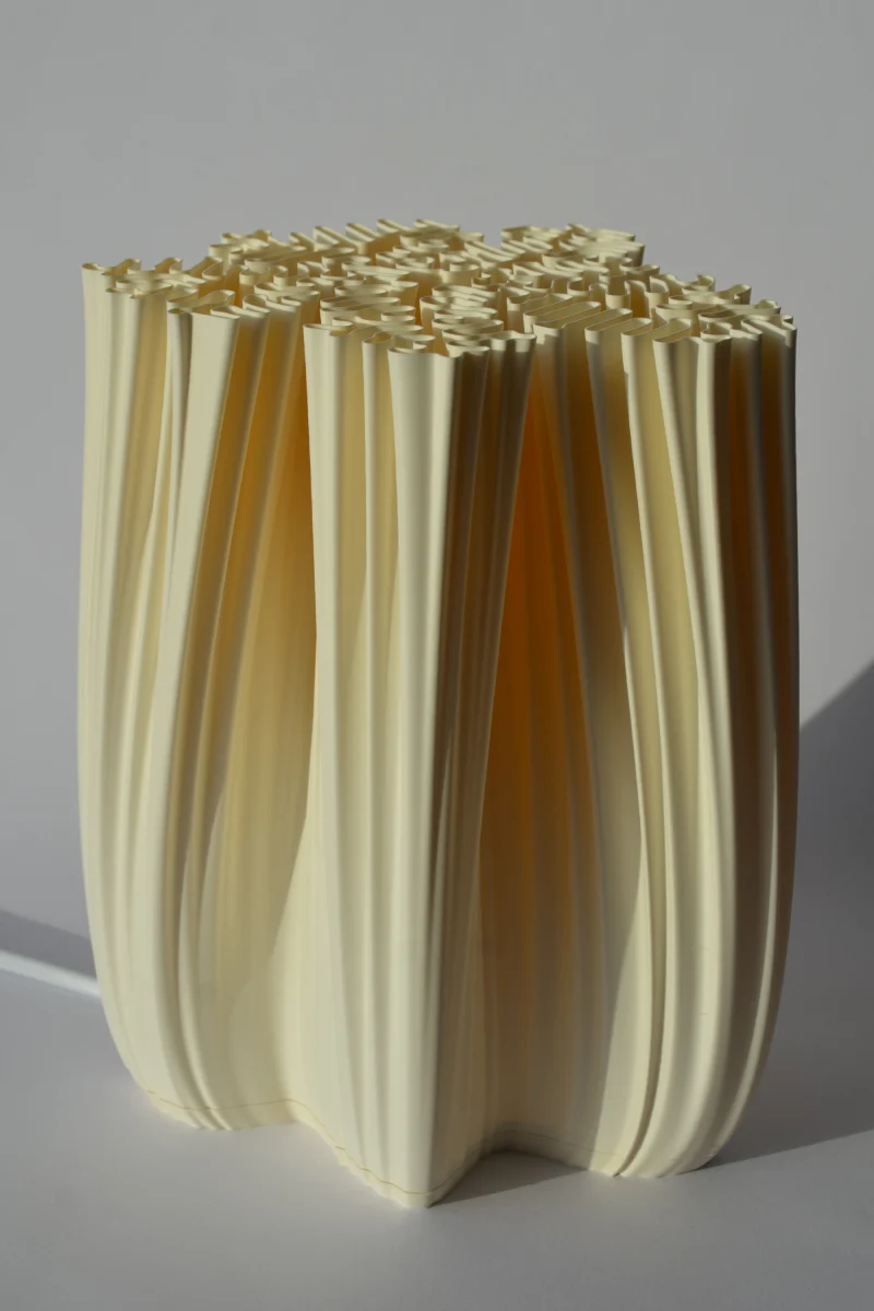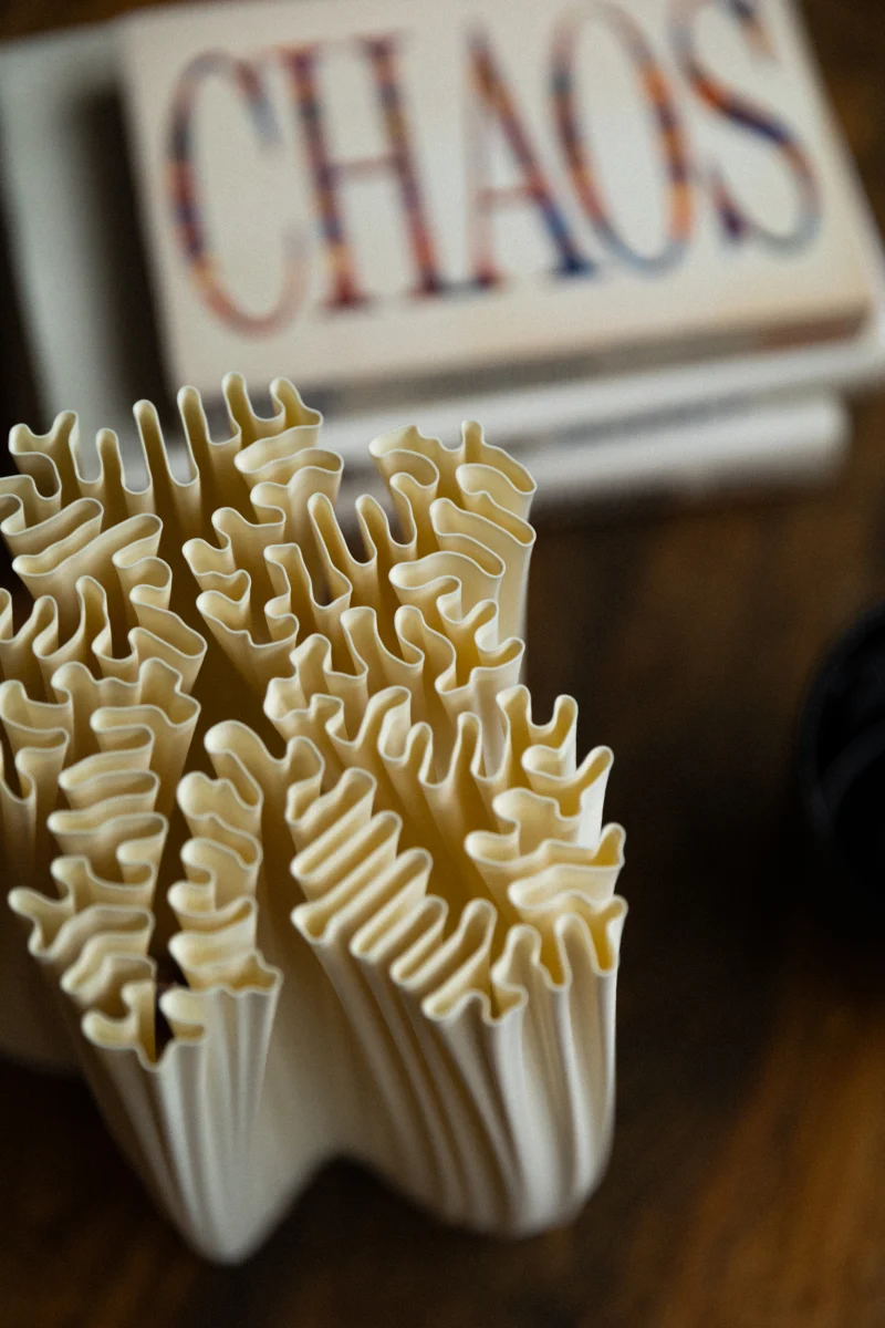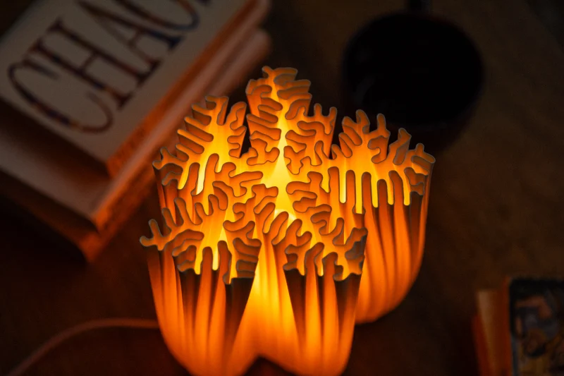 The design features reaction-diffusion patterns that mimic the natural growth processes that create coral’s hypnotic textures. The algorithm captures the interplay of different chemical morphogens spreading and reacting, similar to how coral polyps gradually build their calcium carbonate structures.