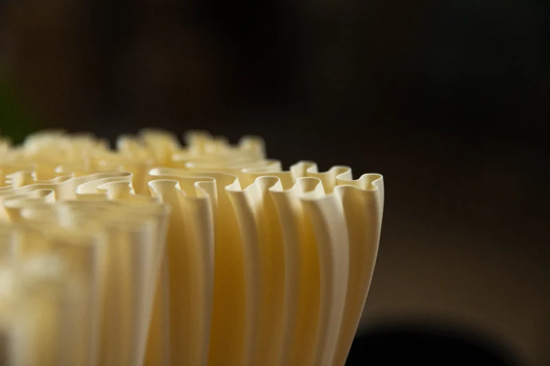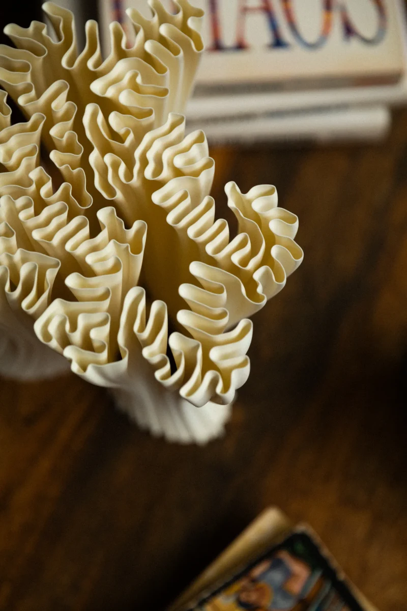The design features reaction-diffusion patterns that mimic the natural growth processes that create coral’s hypnotic textures. The algorithm captures the interplay of different chemical morphogens spreading and reacting, similar to how coral polyps gradually build their calcium carbonate structures.