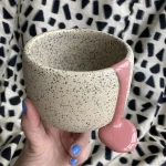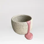 A soft pink gloop pours over the rim like a sweet cherry sugar drop—a thick, flowing glaze that settles into a sculptural accent, contrasting the textured surface beneath. The bowl itself is thrown stoneware, shaped by hand on the pottery wheel, and speckled with melted blue glass dots—like spring raindrops frozen mid-fall. The inside is glazed smooth, while the outside retains a tactile structure, enriched by the shimmering fragments.