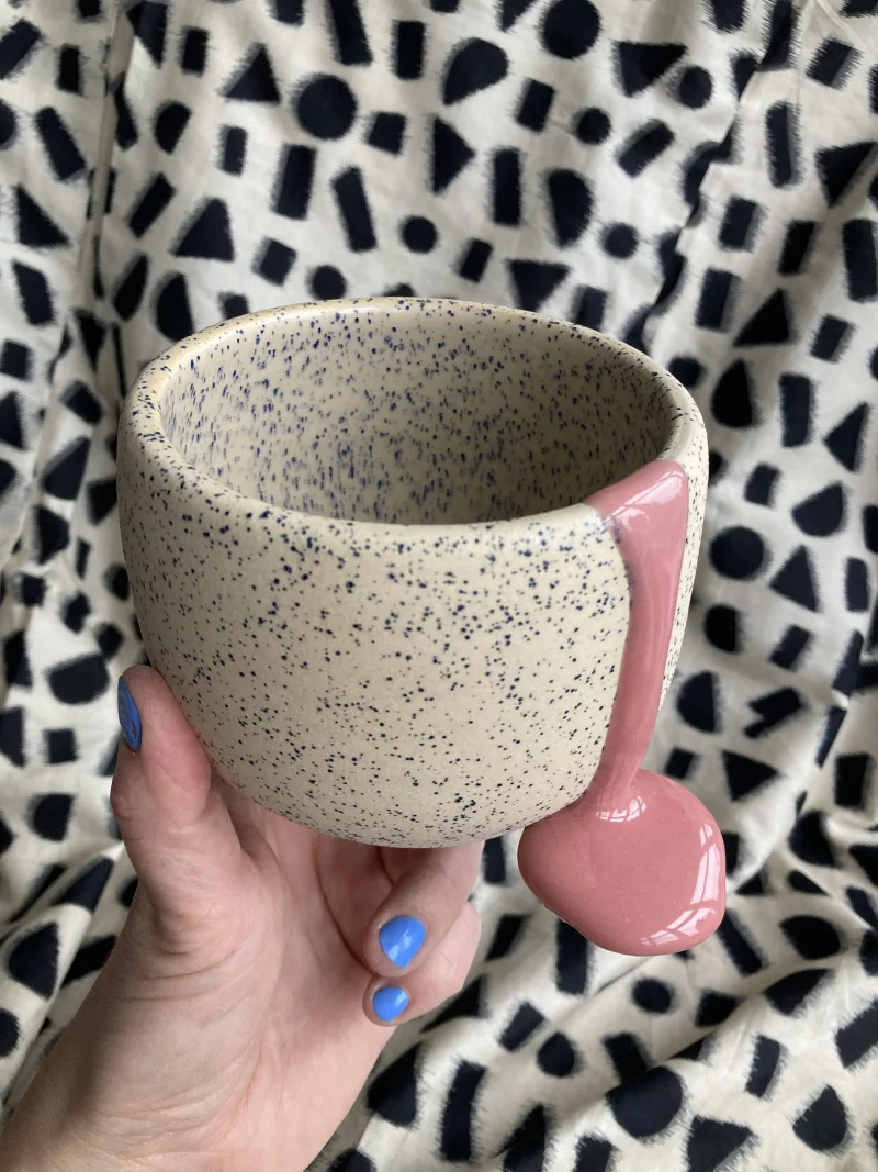 A soft pink gloop pours over the rim like a sweet cherry sugar drop—a thick, flowing glaze that settles into a sculptural accent, contrasting the textured surface beneath. The bowl itself is thrown stoneware, shaped by hand on the pottery wheel, and speckled with melted blue glass dots—like spring raindrops frozen mid-fall. The inside is glazed smooth, while the outside retains a tactile structure, enriched by the shimmering fragments.