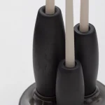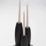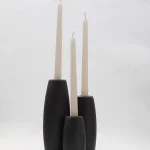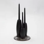 Decorative candleholder with slip casted ceramic base, solid seike wood lathed plynths in Ébano or Gold Leaf finish, and ivory wax candles.
