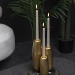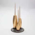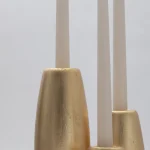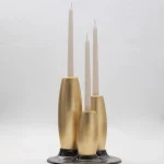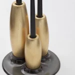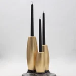 Decorative candleholder with slip casted ceramic base, solid seike wood lathed plynths in Ébano or Gold Leaf finish, and ivory wax candles.