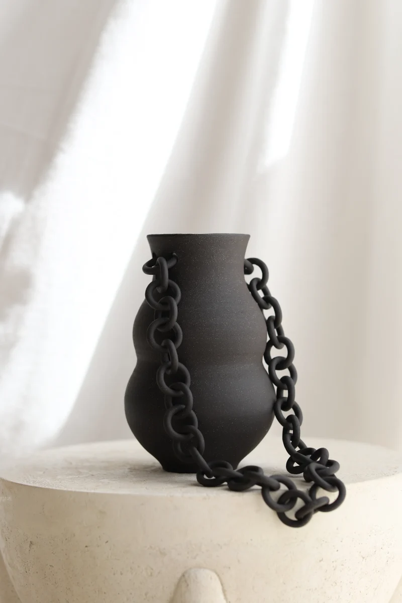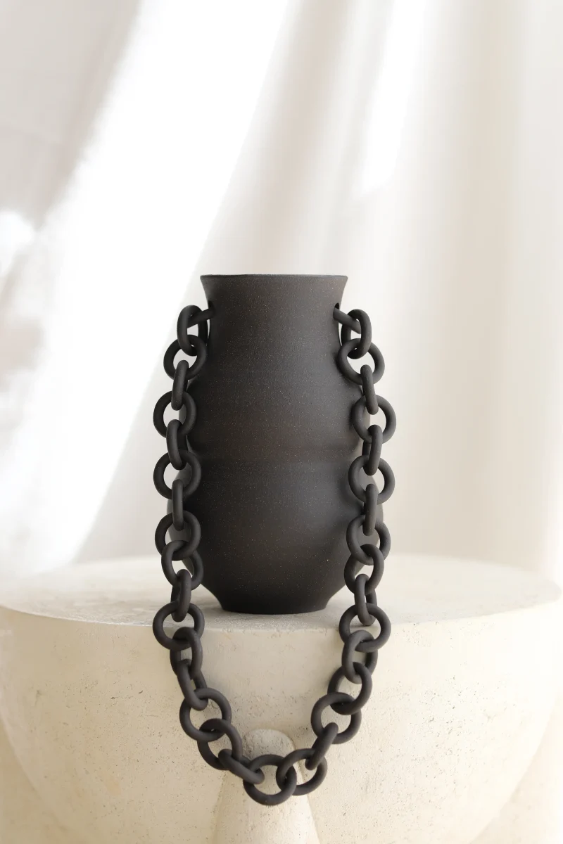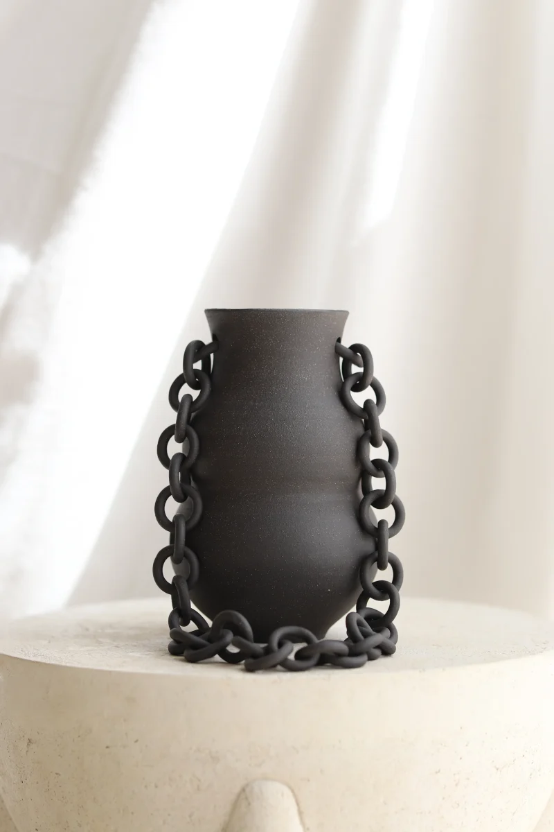 Inspired by the natural and ancient elements of our world, her vessels incorporate free flowing curves and shapes while also combining that with the precision and restrictions of chains. Displaying a juxtaposition of unique and refreshing contrasted with the feeling of being unearthed and lost in time; her vessels are intended to connect with a sense of familiarity to who we are.