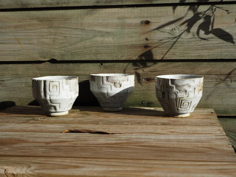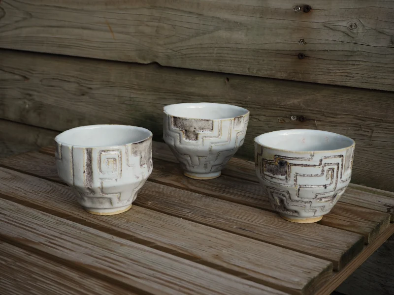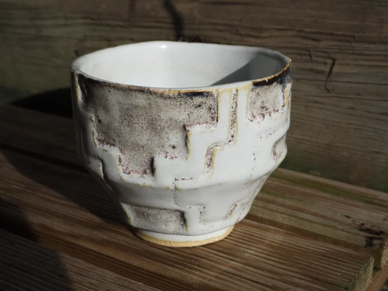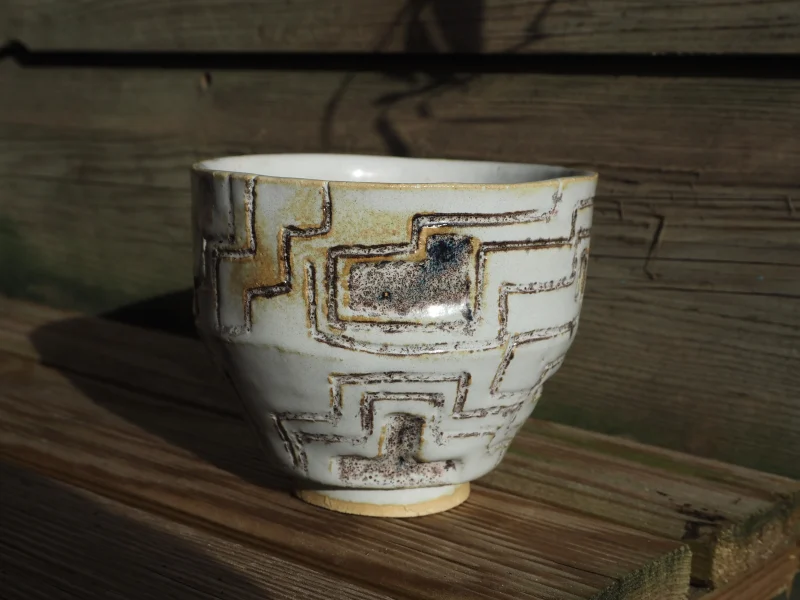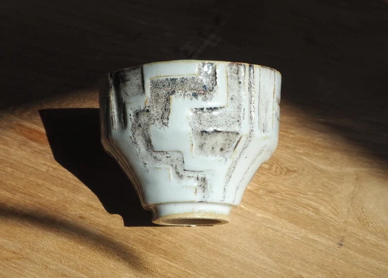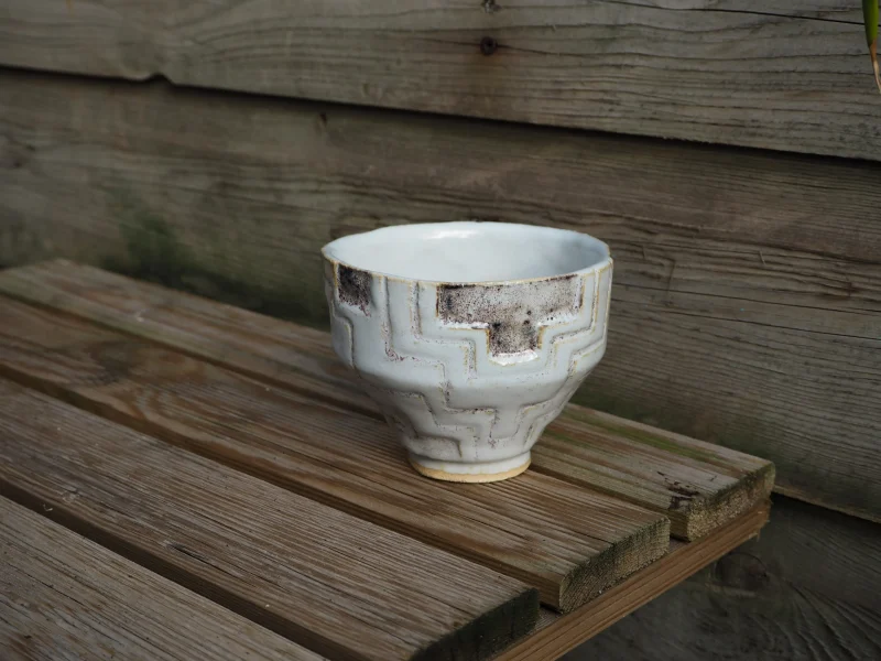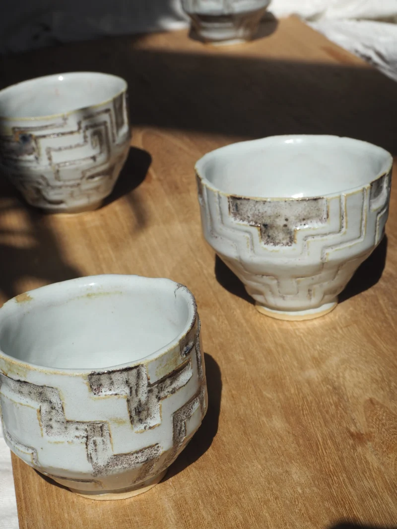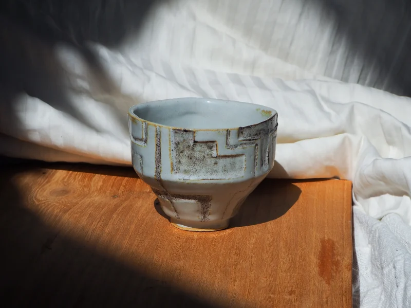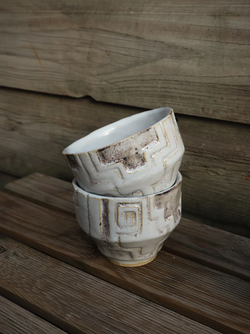 “Samiria” draws inspiration from the traditional Japanese Raku Chawan bowl, reimagined as a sculptural yet functional vessel. Its organic form honors the spirit of ritual and pause, while the surface is hand-carved with Valeria’s interpretation of kené—the intricate visual language of the Shipibo-Konibo people from the Peruvian Amazon. Kené patterns are not merely decorative; they are sacred geometries that represent paths of memory, healing, and connection.