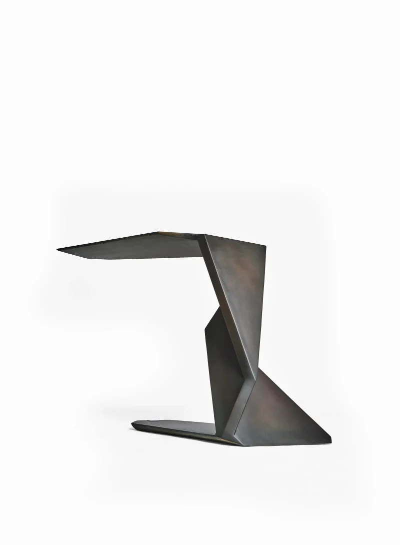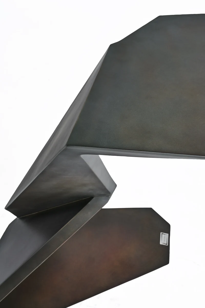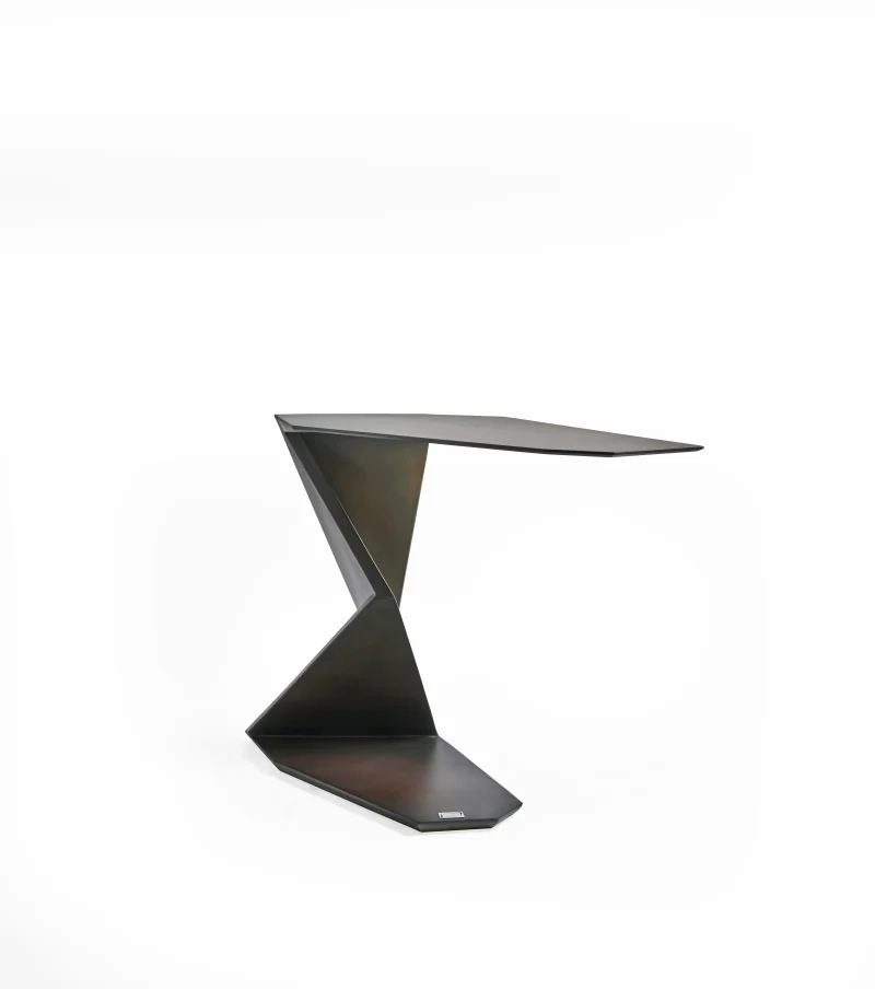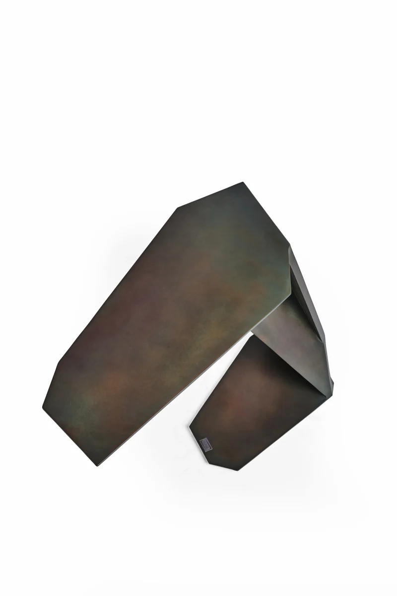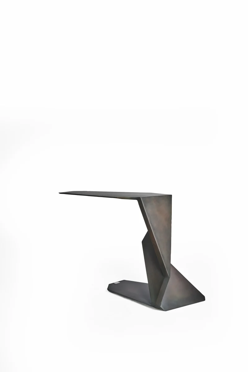 samotraX by ORFEO STUDIO is a console table made entirely of sheet metal composed of connected elements that are completely welded together and polished, the elements that compose it are designed and positioned with a well-defined parametric scheme that ensures a static balance to the piece, the contrast between chiaroscuro declares a poetic and latent style from the geometric prospect, a direct consequence that leads to the independent development of a conceptual design with futuristic lines.