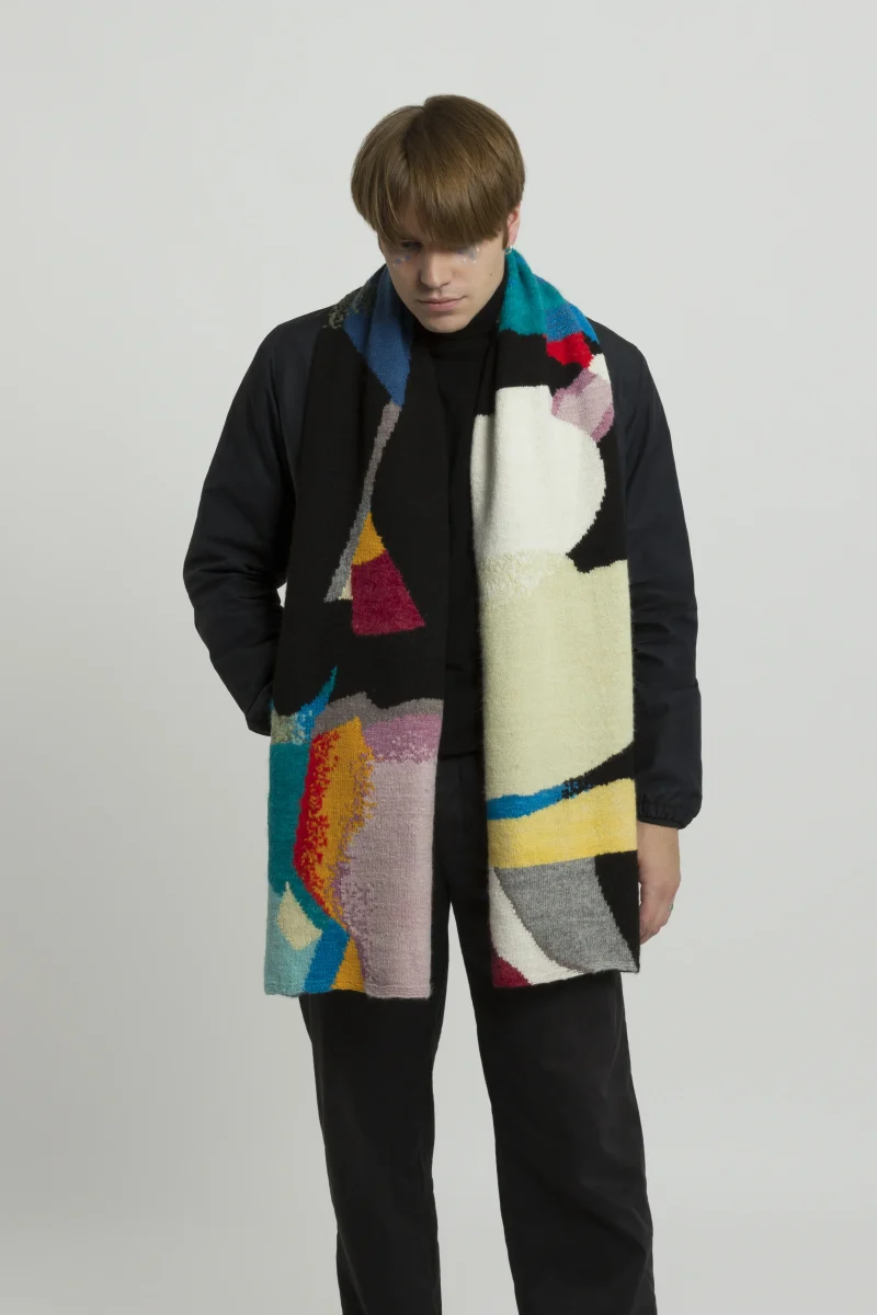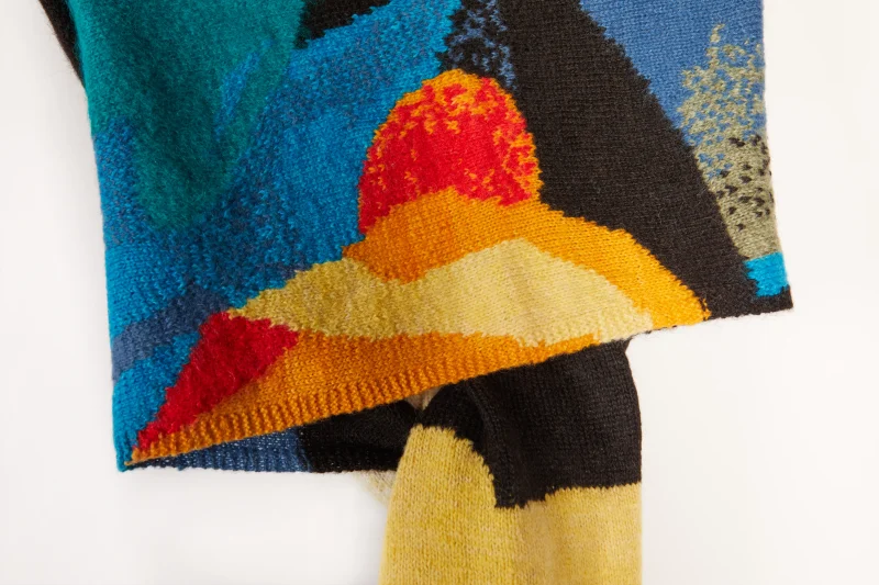 Textile art piece / fashion artefact, co-created by Venezuelan graffiti artist Rafael Gerlach alias SatOne, and Peruvian artisan Norma Vilca de Chavez. Knitted by hand with alpaca fibre.