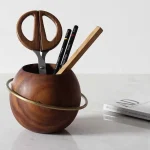 Crafted from solid wood, and ornamented with a brass ring, this elegant pen stand keeps your writing/creating utensils organized.