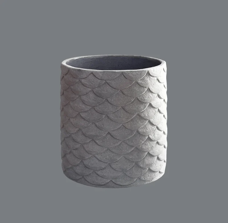 hand built out of blue-grey clay, hand curved with scales pattern.