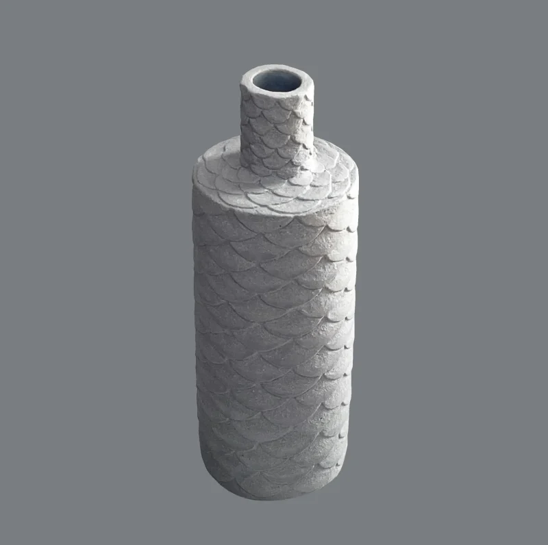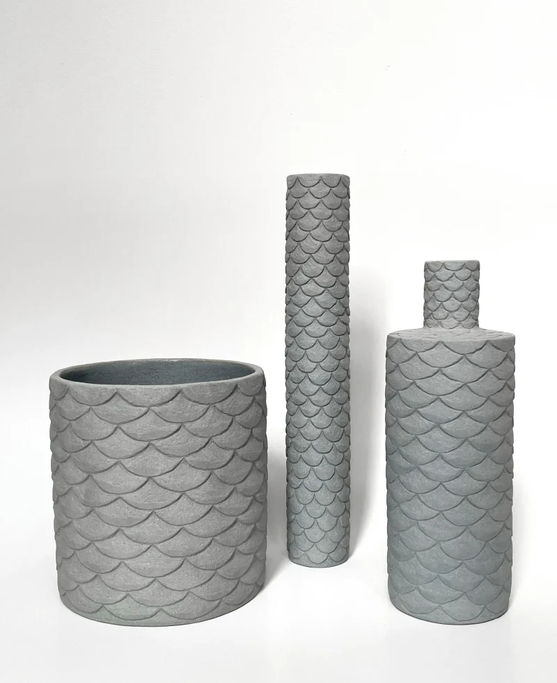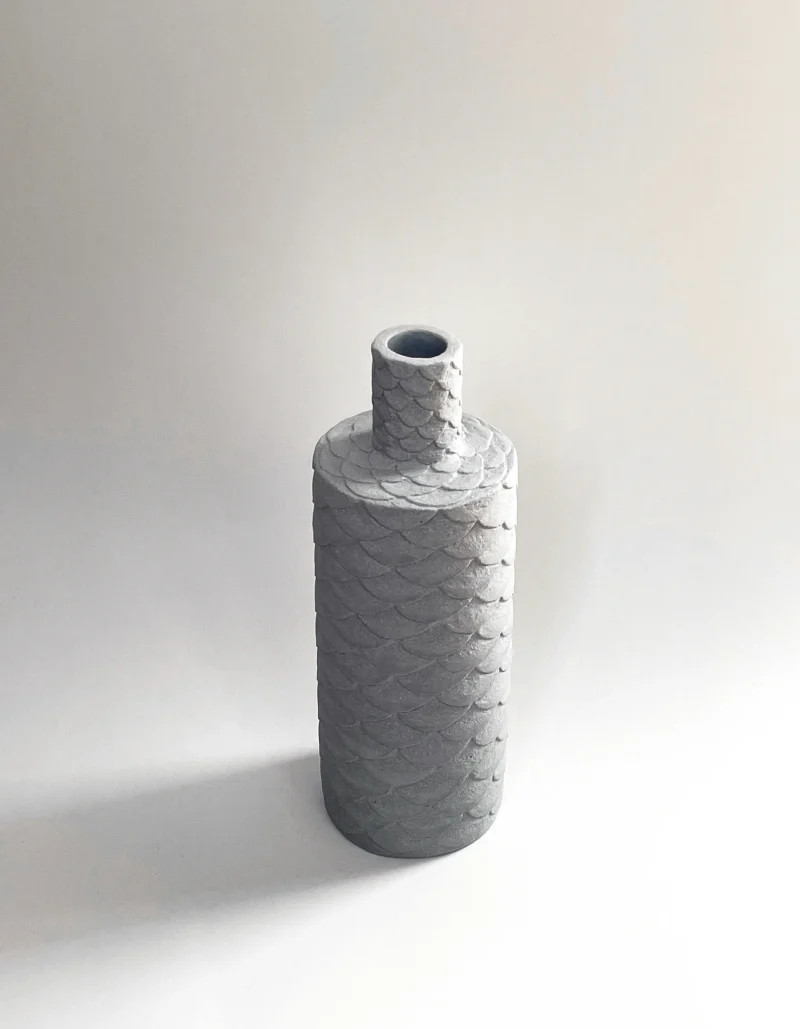 hand built out of blue-grey clay, hand curved with scales pattern.
