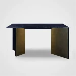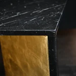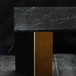 Refined beauty in its element, the Scorcio Dining Table by Nicola Di froscia is made of Nero Marquinia marble and steel, with legs adorned in gold leaf. Depending on the viewer’s perspective, the symmetry of the legs creates a unique opening that acts as a visual illusion. Delicate, dynamic and elegant, the Scorcio is a sculptural-style dining table.