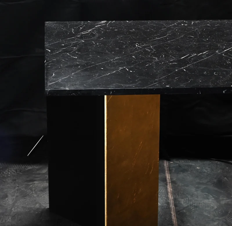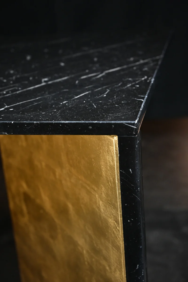 Refined beauty in its element, the Scorcio Dining Table by Nicola Di froscia is made of Nero Marquinia marble and steel, with legs adorned in gold leaf. Depending on the viewer’s perspective, the symmetry of the legs creates a unique opening that acts as a visual illusion. Delicate, dynamic and elegant, the Scorcio is a sculptural-style dining table.
