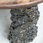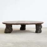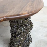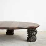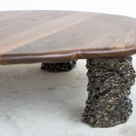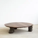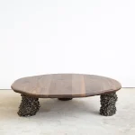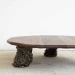 This sculptural coffee table by Alexander Knysch Studio is a stunning blend of craftsmanship and design, meticulously hand-shaped using traditional tools to ensure each piece is entirely unique. The distinctive wood grain of every table highlights the organic beauty of nature, making it a one-of-a-kind work of functional art. The three legs are made of clay. Each leg has an individual handcrafted shape and was sealed with a dark green glaze after firing.