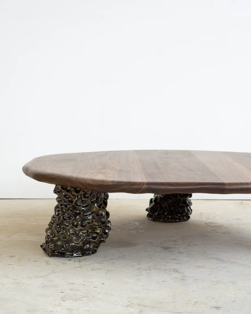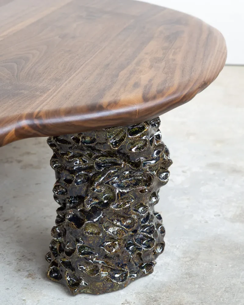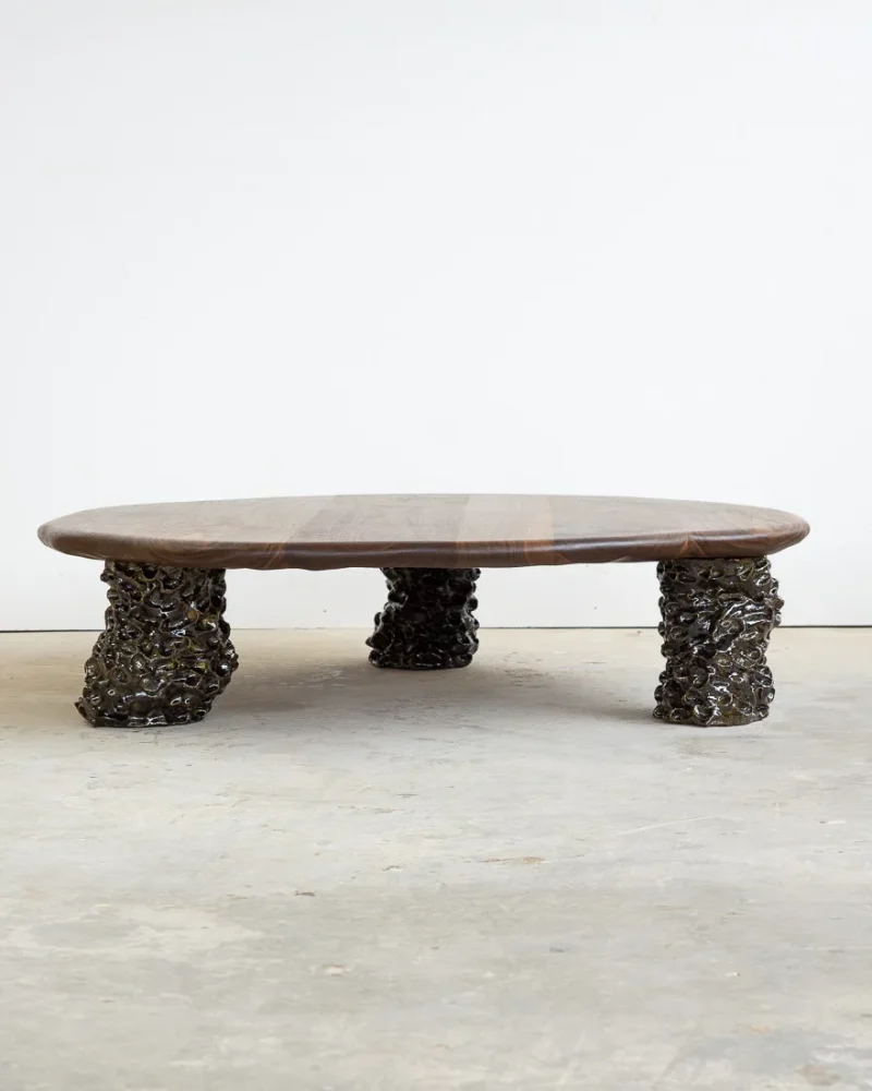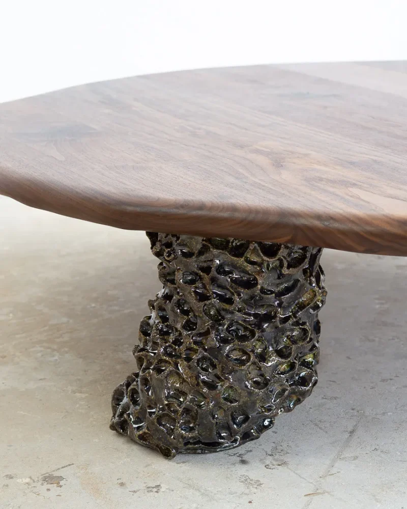 This sculptural coffee table by Alexander Knysch Studio is a stunning blend of craftsmanship and design, meticulously hand-shaped using traditional tools to ensure each piece is entirely unique. The distinctive wood grain of every table highlights the organic beauty of nature, making it a one-of-a-kind work of functional art. The three legs are made of clay. Each leg has an individual handcrafted shape and was sealed with a dark green glaze after firing.