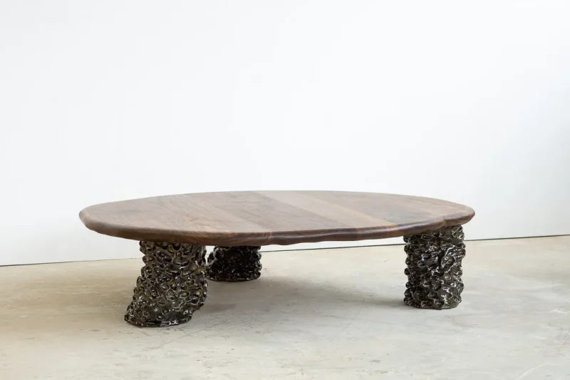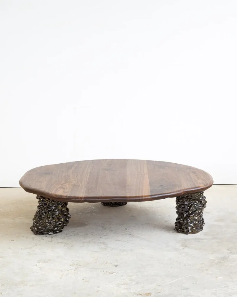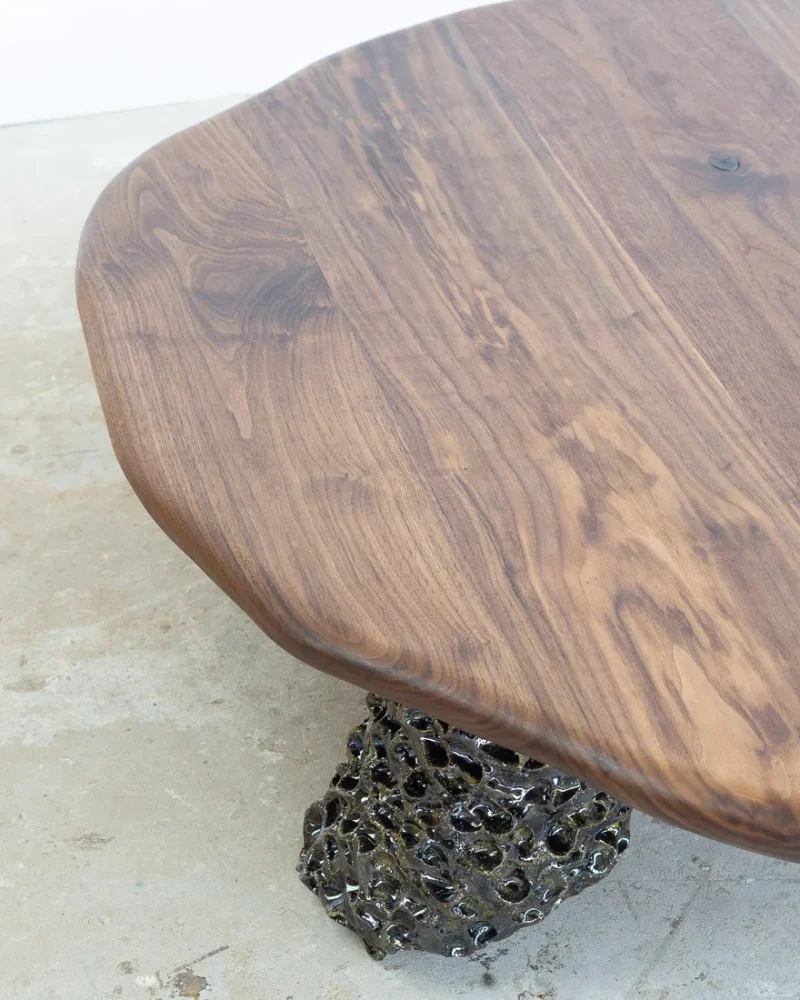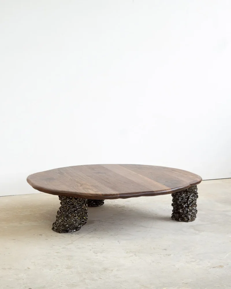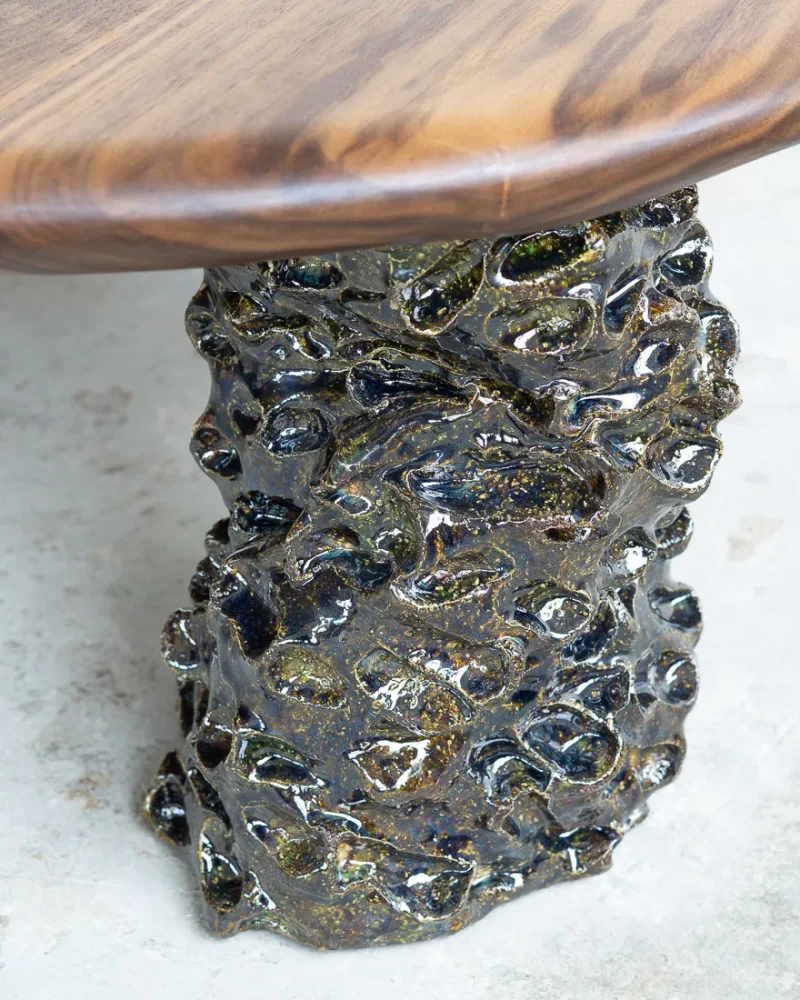 This sculptural coffee table by Alexander Knysch Studio is a stunning blend of craftsmanship and design, meticulously hand-shaped using traditional tools to ensure each piece is entirely unique. The distinctive wood grain of every table highlights the organic beauty of nature, making it a one-of-a-kind work of functional art. The three legs are made of clay. Each leg has an individual handcrafted shape and was sealed with a dark green glaze after firing.