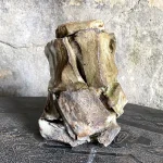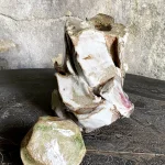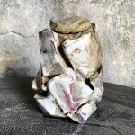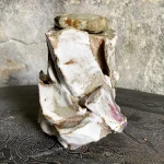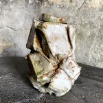 This sculptural lidded vessel by Elena Yakimushkina is a standout piece in the “On the Rocks” series. It embodies artistic expression and functional design. Its lid, decorated with an ash glaze, resembles a precious gemstone, adding refined elegance to its rough, angular form.