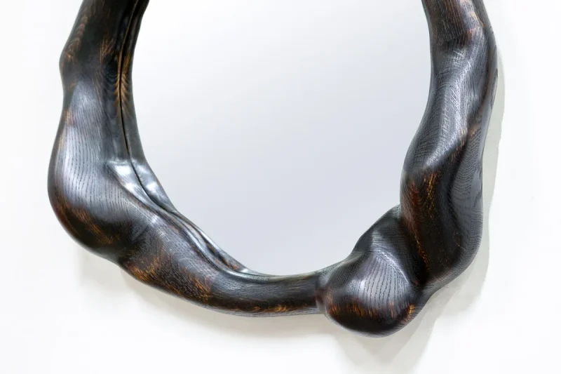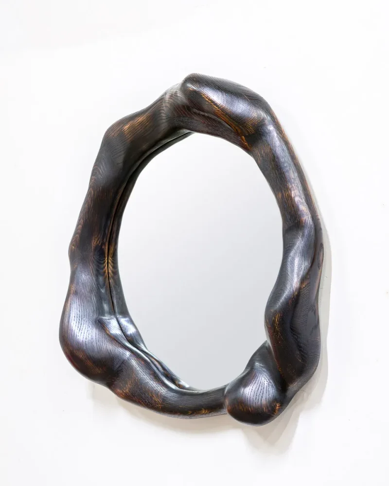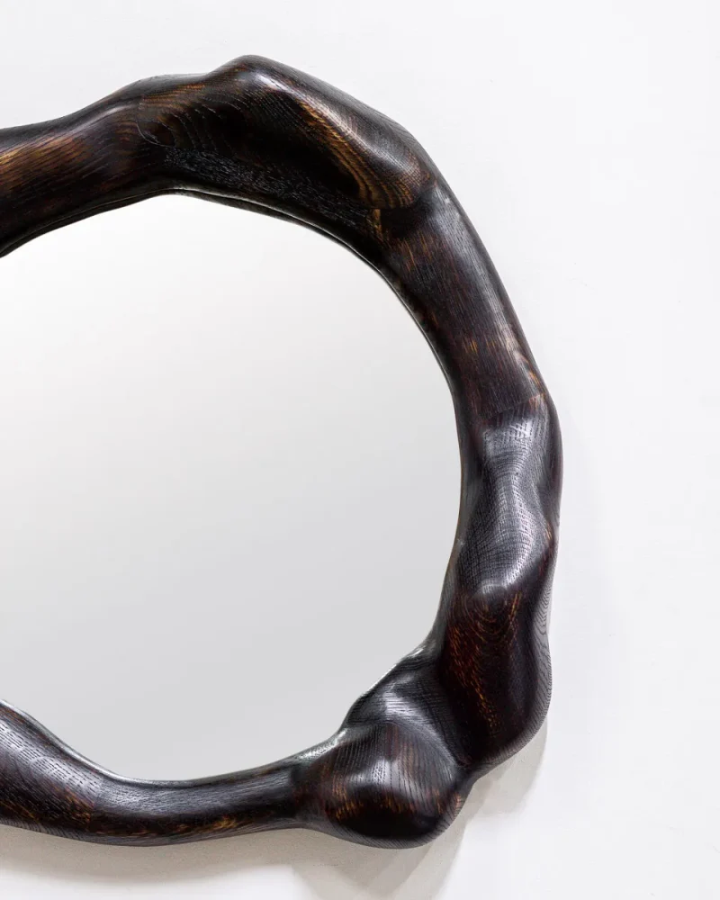 This mirror by Alexander Knysch Studio is a testament to artisanal craftsmanship, featuring a meticulously shaped frame crafted using an array of hand tools. Each piece boasts a unique character, highlighted by its distinctive wood grain patterns. Made from premium-quality oak, the frame undergoes a careful process of light burning to enhance its natural texture, followed by a finish of durable hard wax oil that adds both warmth and resilience. Designed for elegance and functionality, the mirror is securely mounted on the wall using a discreet, wall-mounted fixture, blending timeless design with practical sophistication.