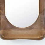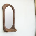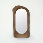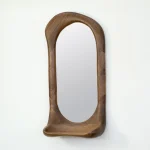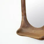 This sculptural mirror with a shelf by Alexander Knysch Studio is a masterful blend of artistry and functionality designed to elevate any space. The frame and integrated shelf are meticulously handcrafted using traditional tools, ensuring each piece is truly unique and showcases the distinctive grain patterns of premium walnut wood. The wood is finished with a protective hard-wax oil that preserves its warm tones and smooth feel.