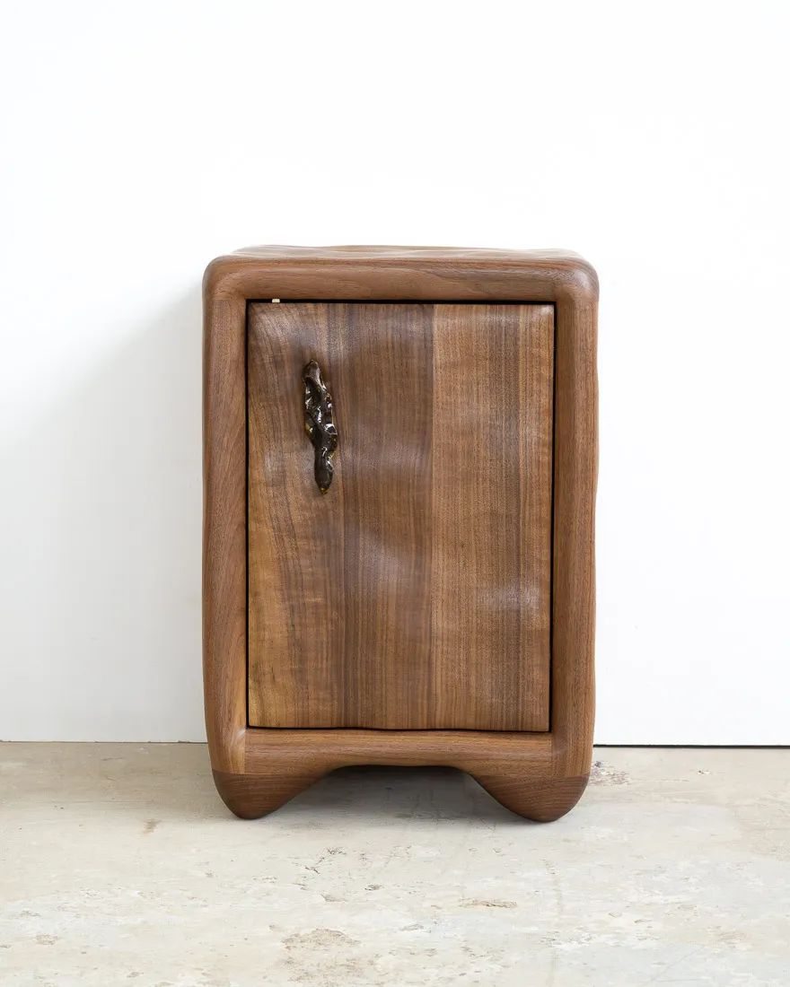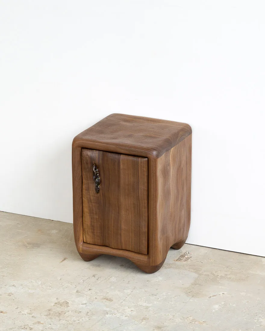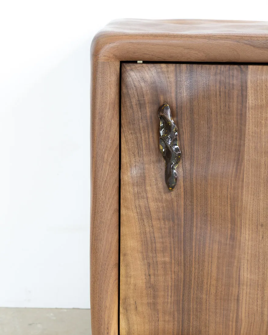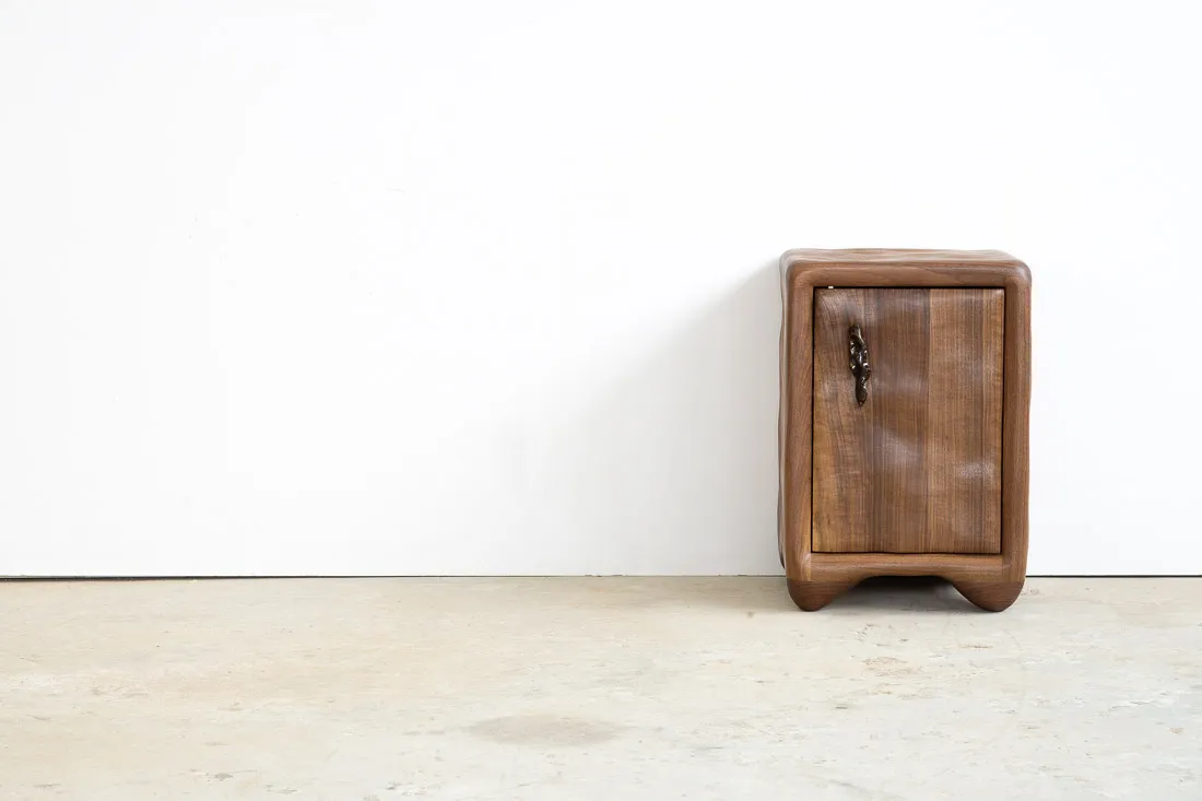 This nightstand by Alexander Knysch Studio is a striking fusion of artistry and functionality. Meticulously shaped using traditional hand tools, each piece is entirely unique, showcasing the distinctive grain patterns and natural character of high-quality walnut wood. The nightstand features a seamlessly integrated door, blending practicality with refined design. The handle is handcrafted from clay and sealed with a dark green glaze. Finished with a protective hard wax oil, it boasts a smooth, lustrous surface that highlights the warmth and richness of the wood while ensuring durability. This nightstand is a timeless and elegant addition to any space, offering both style and functionality in equal measure.