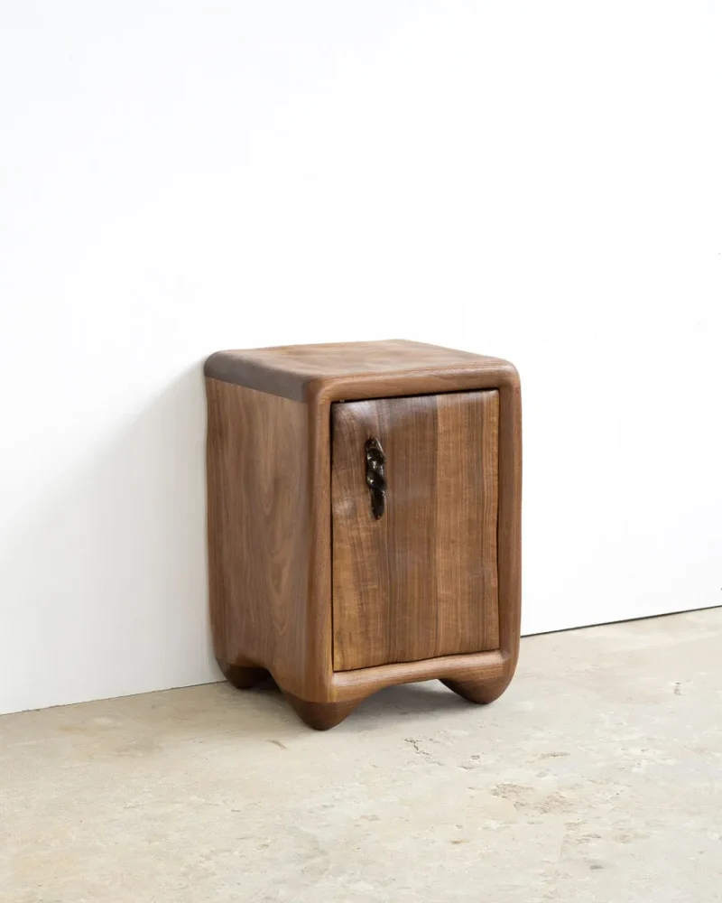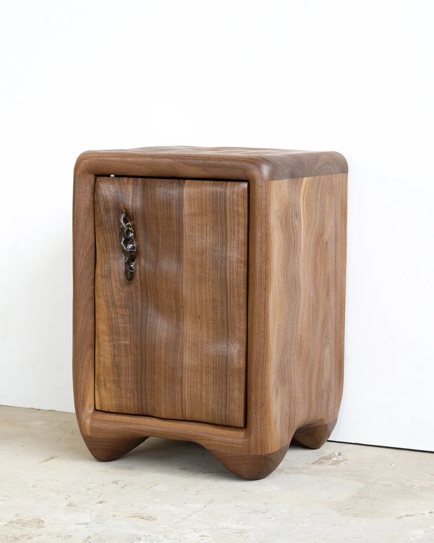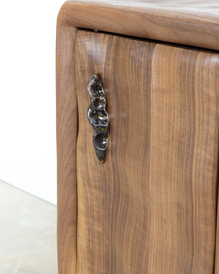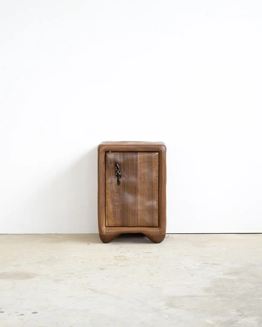 This nightstand by Alexander Knysch Studio is a striking fusion of artistry and functionality. Meticulously shaped using traditional hand tools, each piece is entirely unique, showcasing the distinctive grain patterns and natural character of high-quality walnut wood. The nightstand features a seamlessly integrated door, blending practicality with refined design. The handle is handcrafted from clay and sealed with a dark green glaze. Finished with a protective hard wax oil, it boasts a smooth, lustrous surface that highlights the warmth and richness of the wood while ensuring durability. This nightstand is a timeless and elegant addition to any space, offering both style and functionality in equal measure.