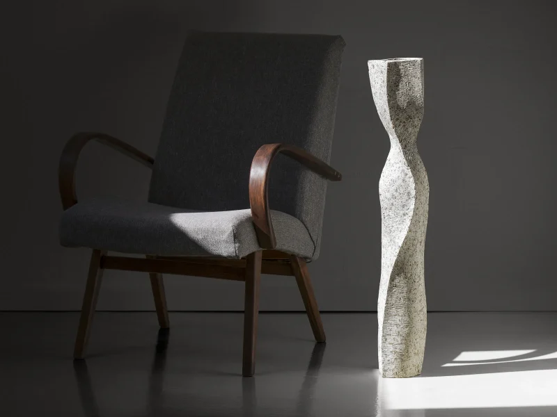 The material from which the vase is made is the result of various experiments. It is a mixture of several components: the largest part being paper pulp and cardboard. Although paper is often associated with fragility, when mixed with other materials and dried, it acquires the properties of wood, a natural texture, becomes strong, but is slightly elastic, so it does not split or crumble.