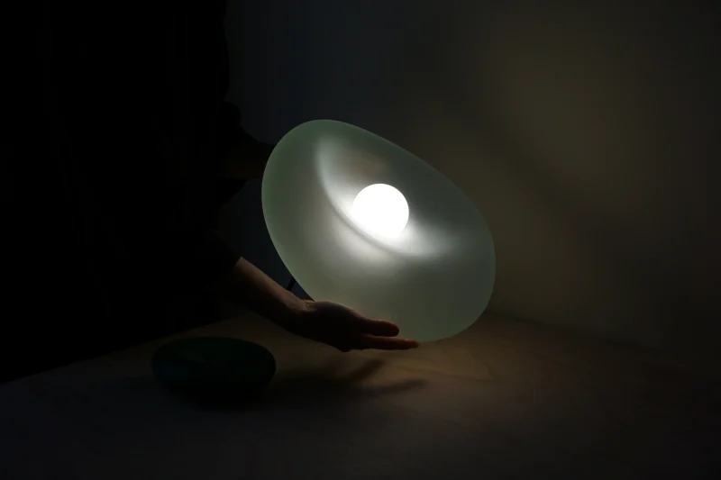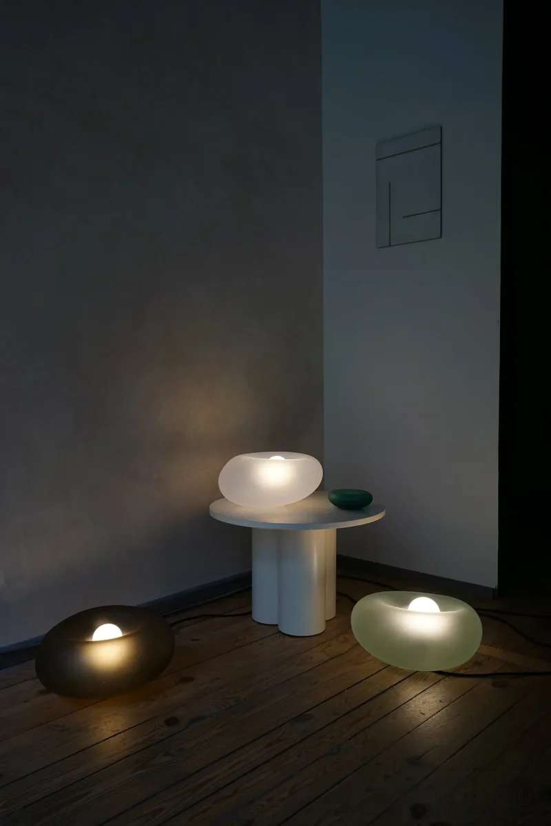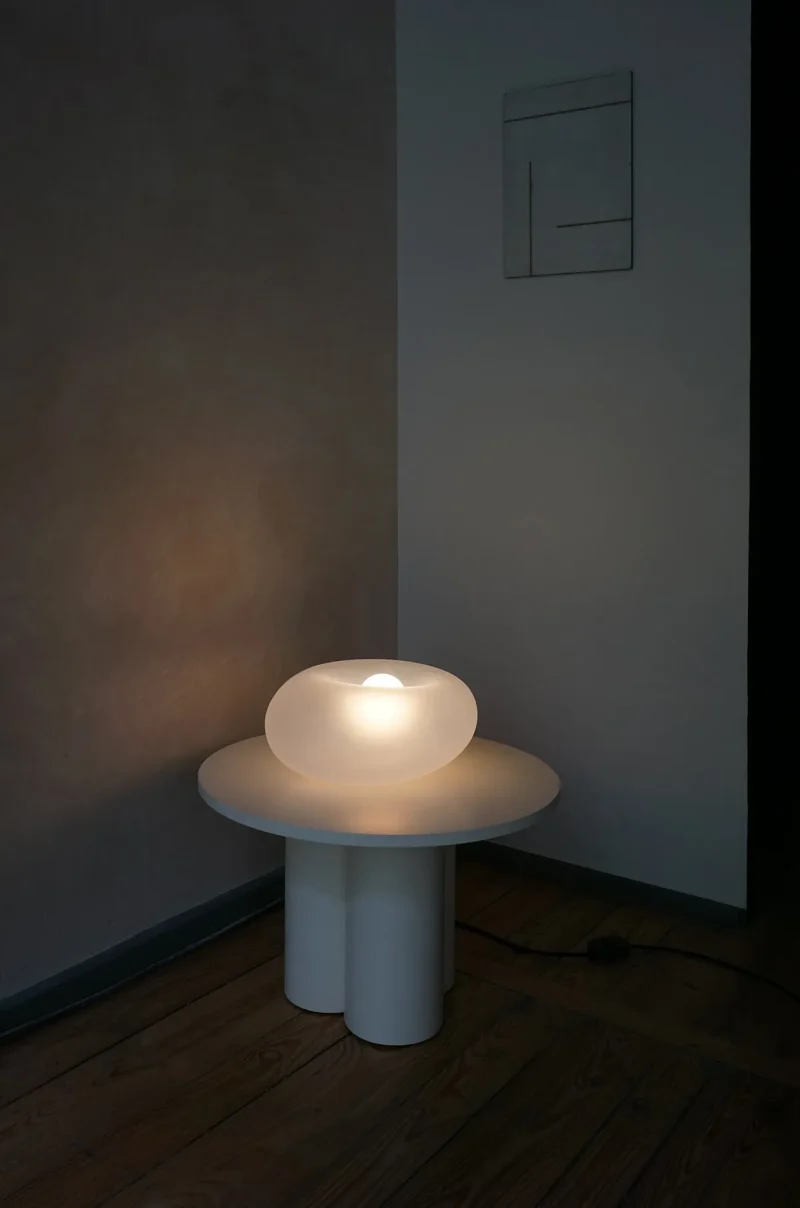 This soothing soft light object is crafted upon your order especially for you. Each mouth-blown table or floor light object is made by hand and smoothed by sand for a super soft natural finish. A regular generous matte light bulb is sunken in the glass body to radiate an atmosphere of calmness and minimalist naturalism.