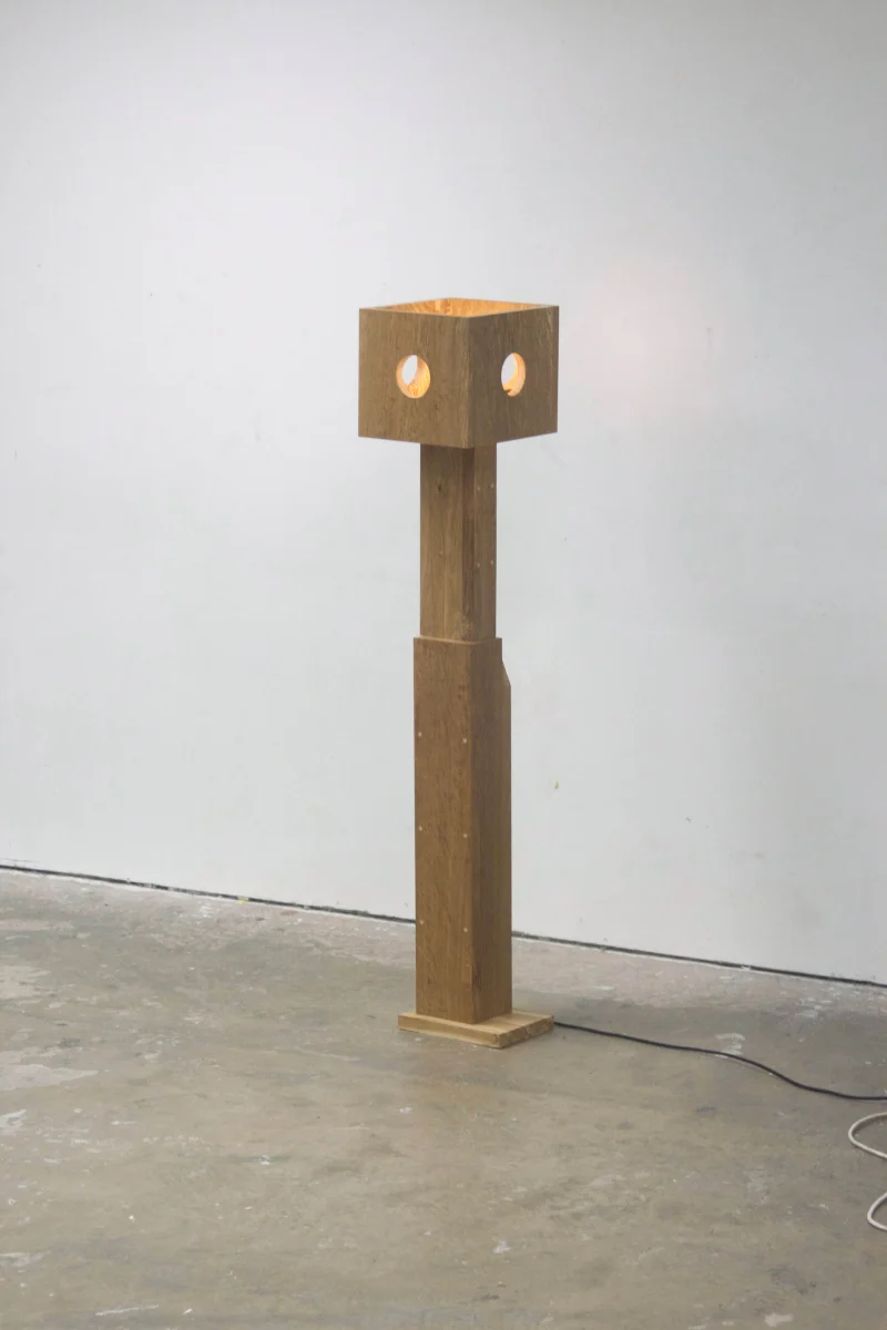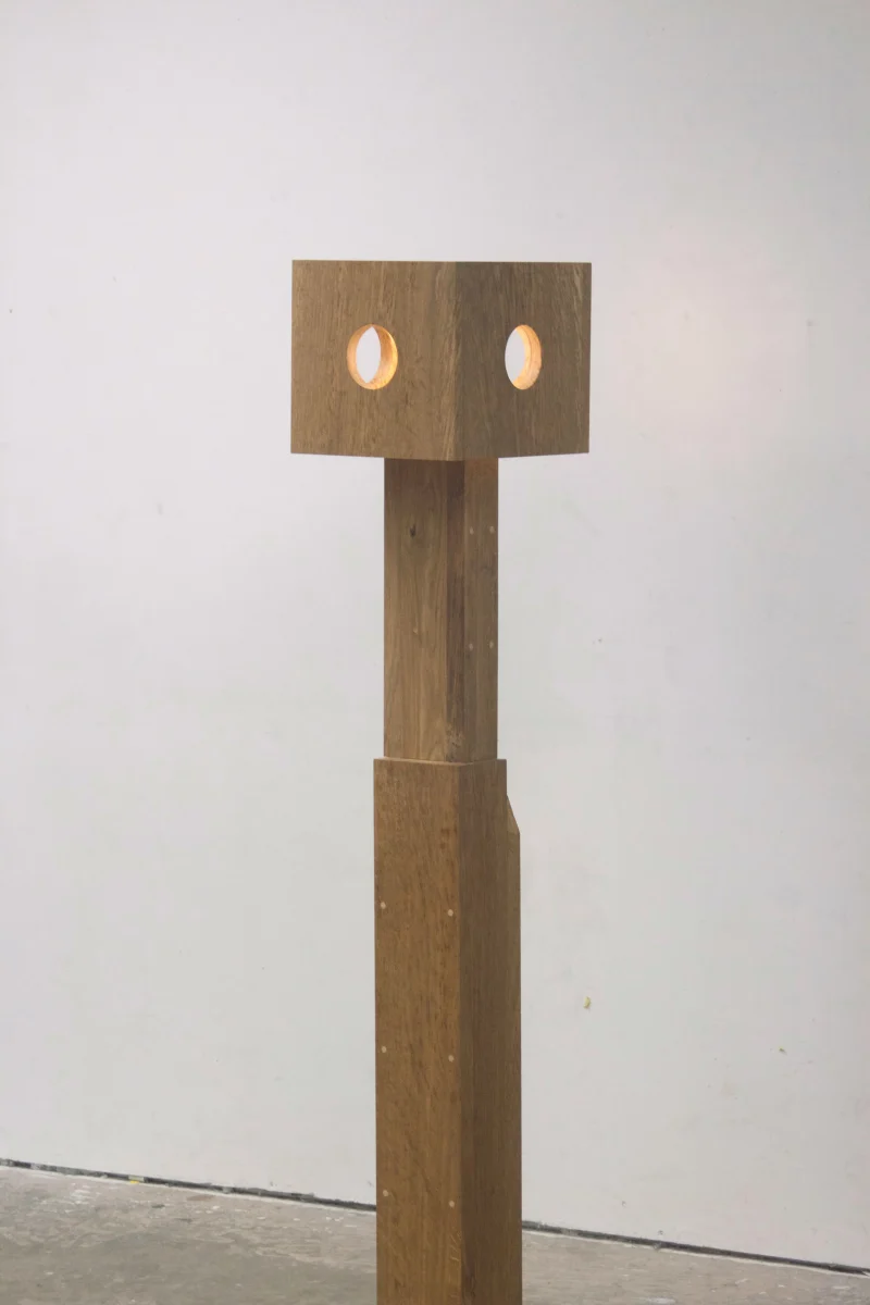 Unique piece / 150x20x20 / Brown Oak / G9 LED under satin glass globe / Assembled with beech dowels.