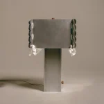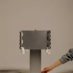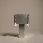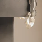In the Serwetka Lamp, perforations in the aluminum echo the lace-like voids of embroidery. These cut-outs allow the aluminum sheets to be “stitched” together with gathered textile ruffles, turning decorative into functional.
