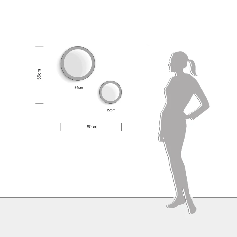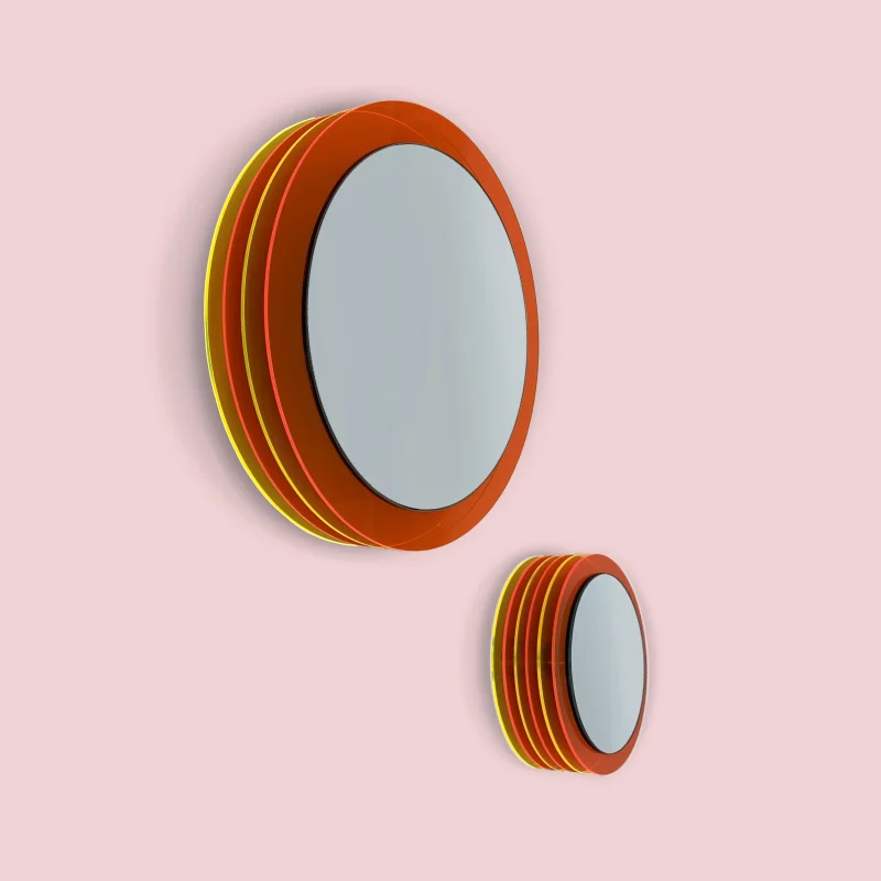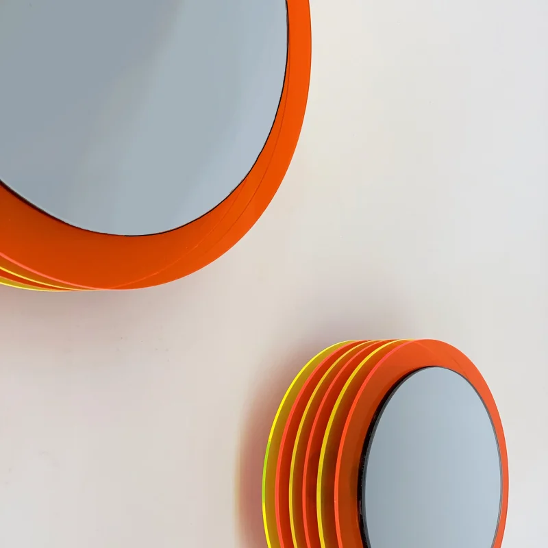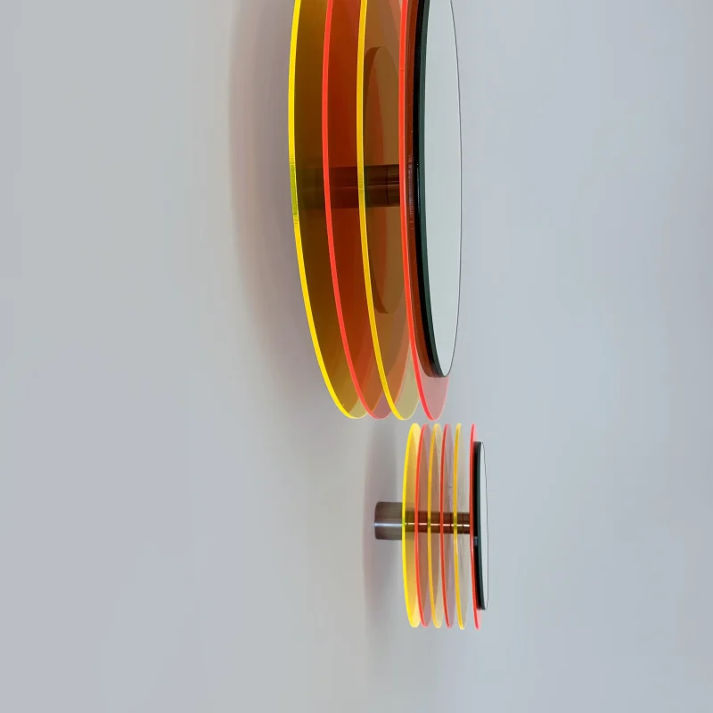 The SUNSET WALL MIRRORS are inspired by Art déco and the 70s. The arrangement of translucent and light-conducting Plexiglas panes results in beautiful optical effects and a sculptural character. The mirror objects float in front of the wall and create fascinating sculptures full of positive energy through colour, light and translucency and are “last but not least” mirrors on the wall. Depending on the ambient light, the appearance changes with more or less luminous edges and interesting colour effects. The mirrors (without the edges) have a diameter of 18cm and 28cm.
