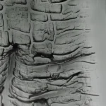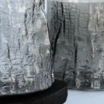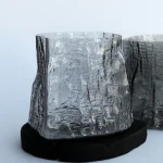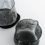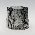 The wooden mould changes continuously during the glass blowing process and eventually burns down. Thus, each mould makes a limited edition of unique pieces. A sequence number is assigned to each piece, and due to the design and the technique, each object is one of a kind, and its shape, texture, dimensions, and weight differ, as if it would be grown from the earth. Moulds for glassblowing are made out of up-cycled local timber consciously selected by the designer to achieve a variety of structures.
