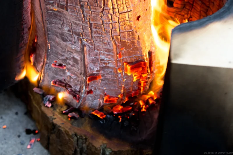 The making process is a captivating synergy of elements — the tiniest details of a momentary structure of burning wood are captured with molten hot glass, continuously changing shape.