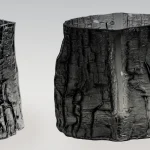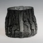 The wooden mould changes continuously during the glass blowing process and eventually burns down. Thus, each mould makes a limited edition of unique pieces. A sequence number is assigned to each piece, and due to the design and the technique, each object is one of a kind, and its shape, texture, dimensions, and weight differ, as if it would be grown from the earth. Moulds for glassblowing are made out of up-cycled local timber consciously selected by the designer to achieve a variety of structures.