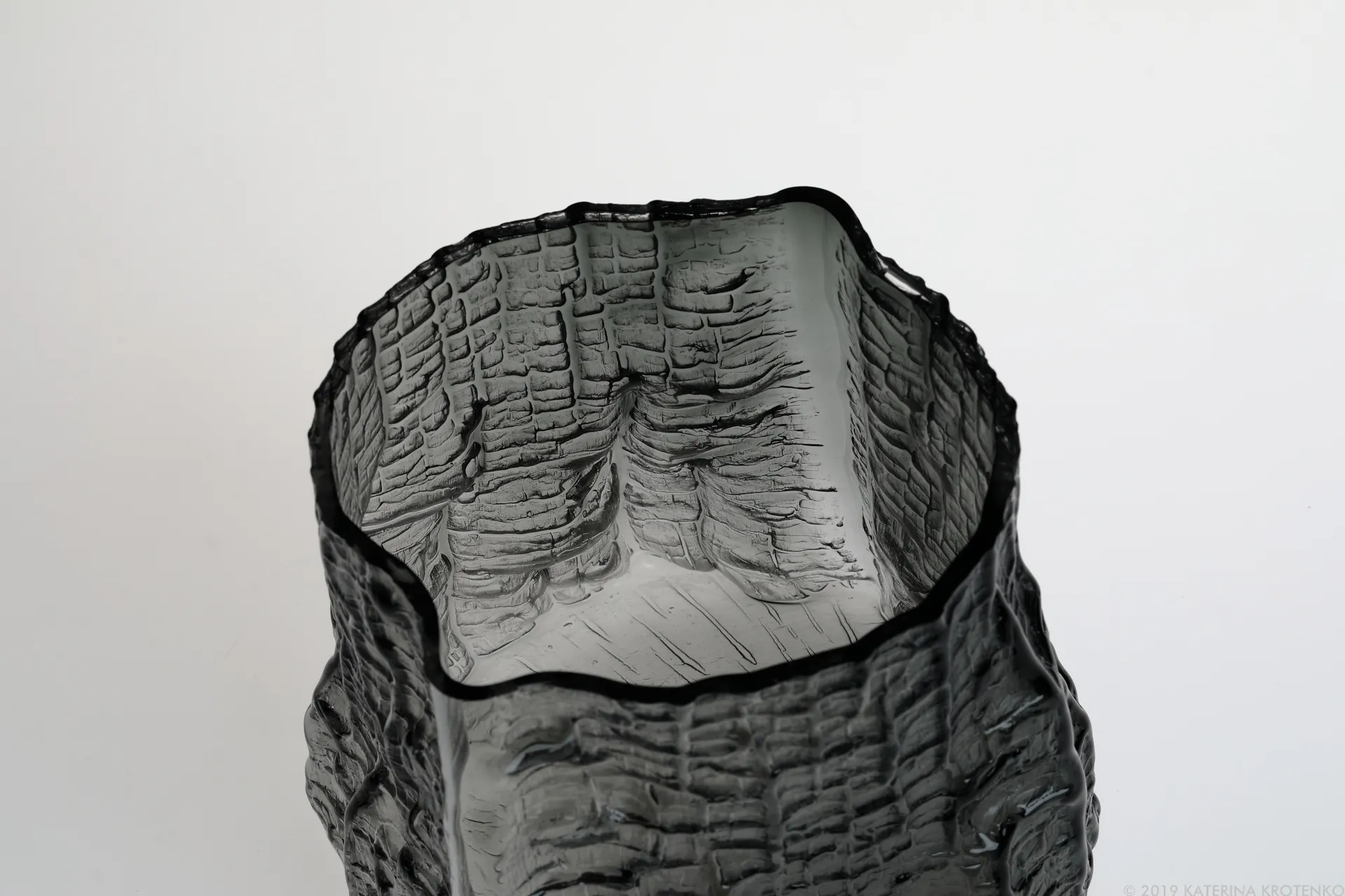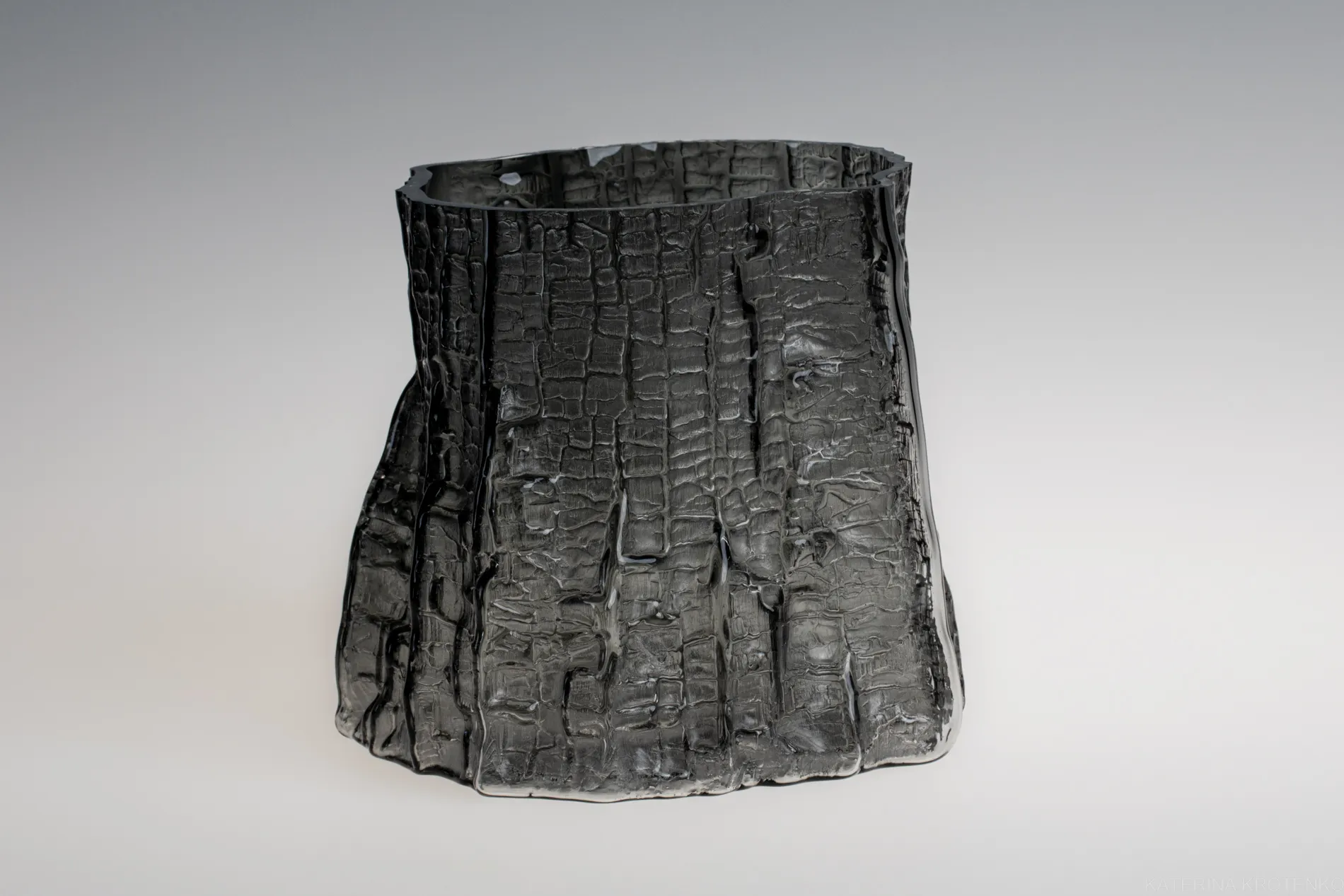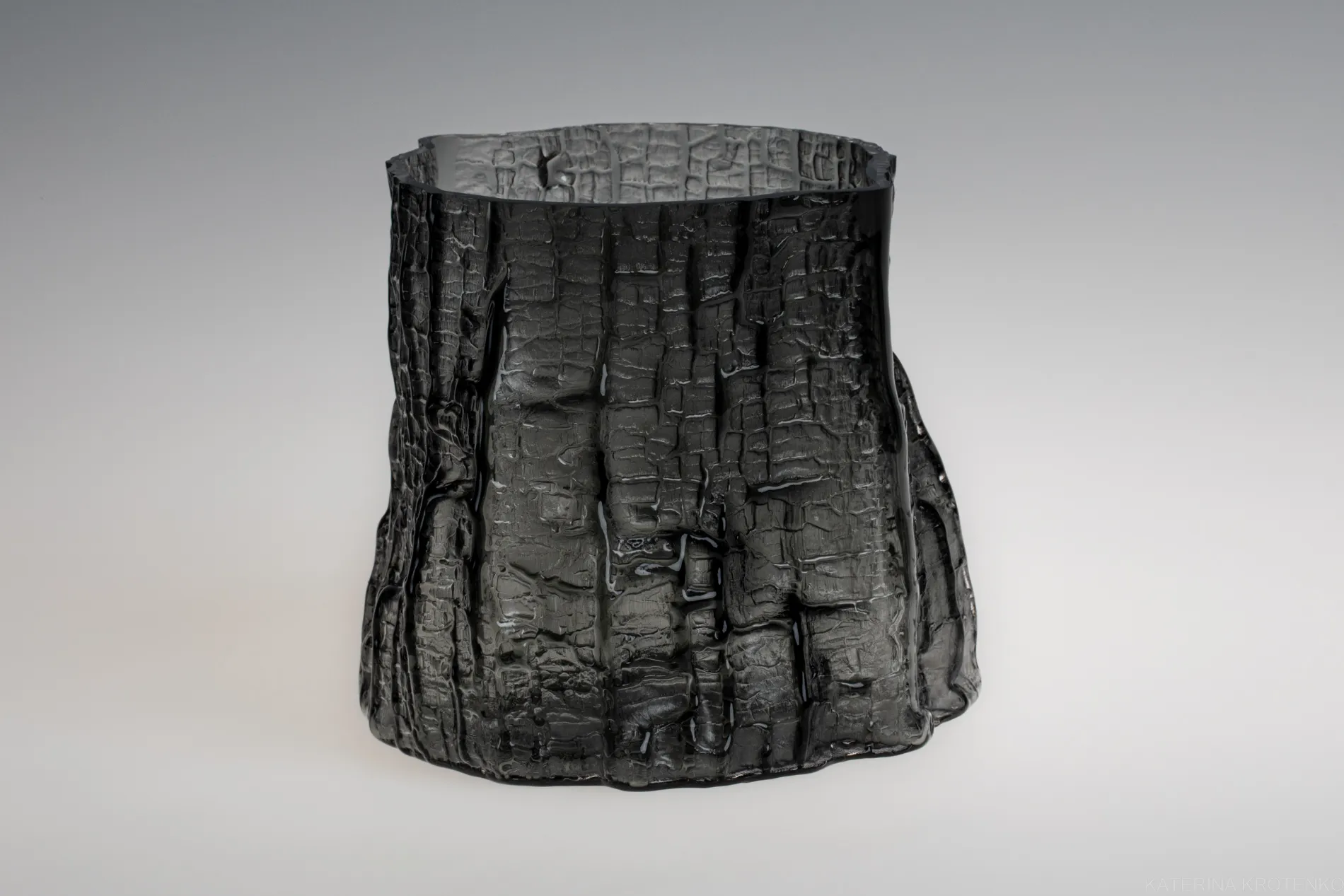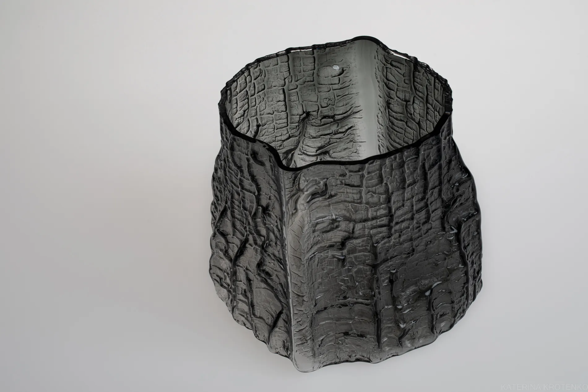 The wooden mould changes continuously during the glass blowing process and eventually burns down. Thus, each mould makes a limited edition of unique pieces. A sequence number is assigned to each piece, and due to the design and the technique, each object is one of a kind, and its shape, texture, dimensions, and weight differ, as if it would be grown from the earth. Moulds for glassblowing are made out of up-cycled local timber consciously selected by the designer to achieve a variety of structures.