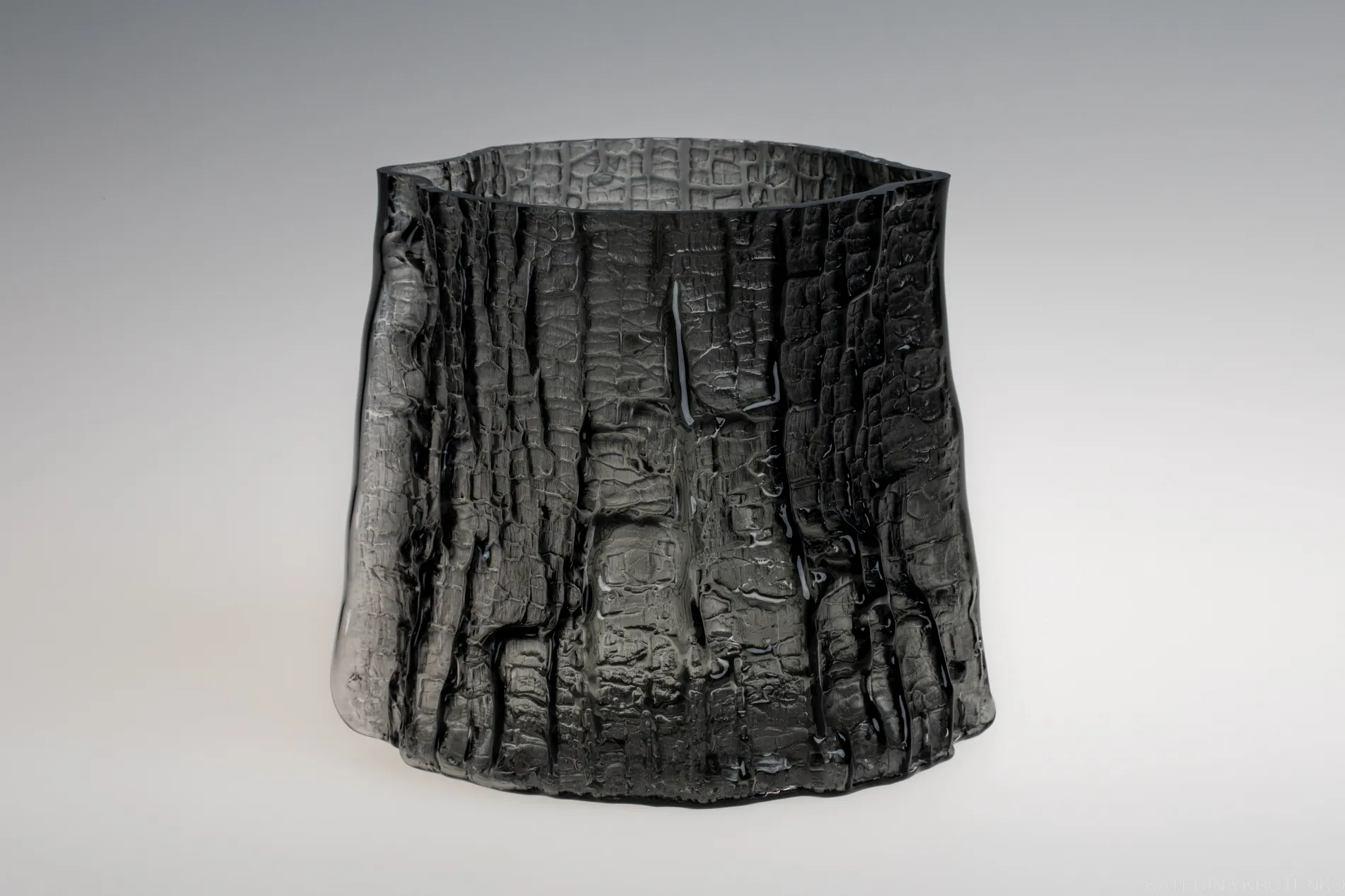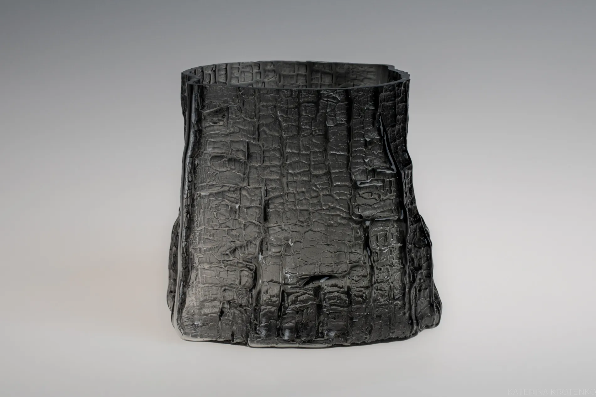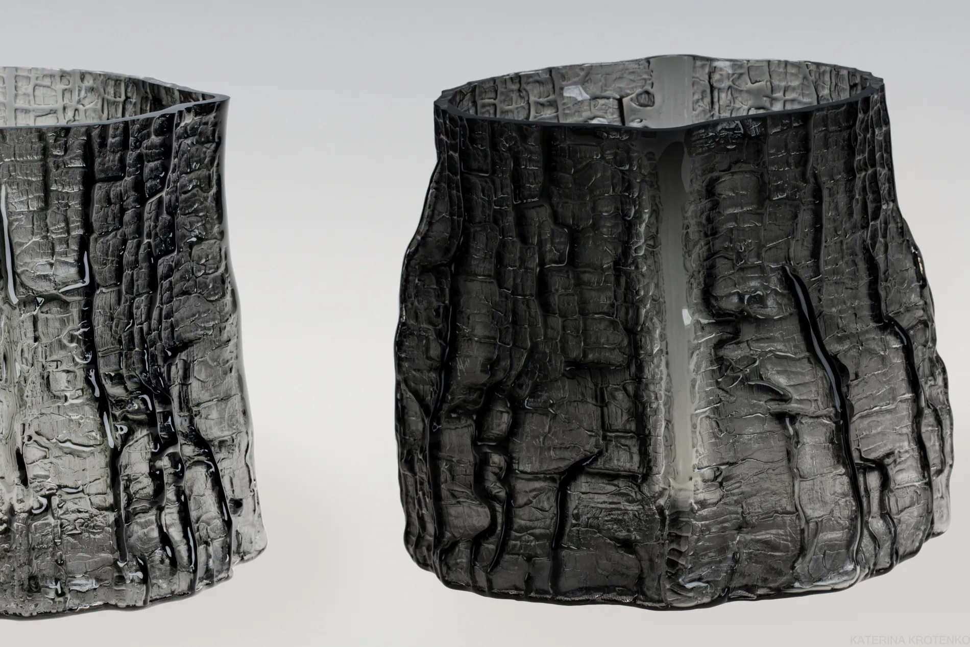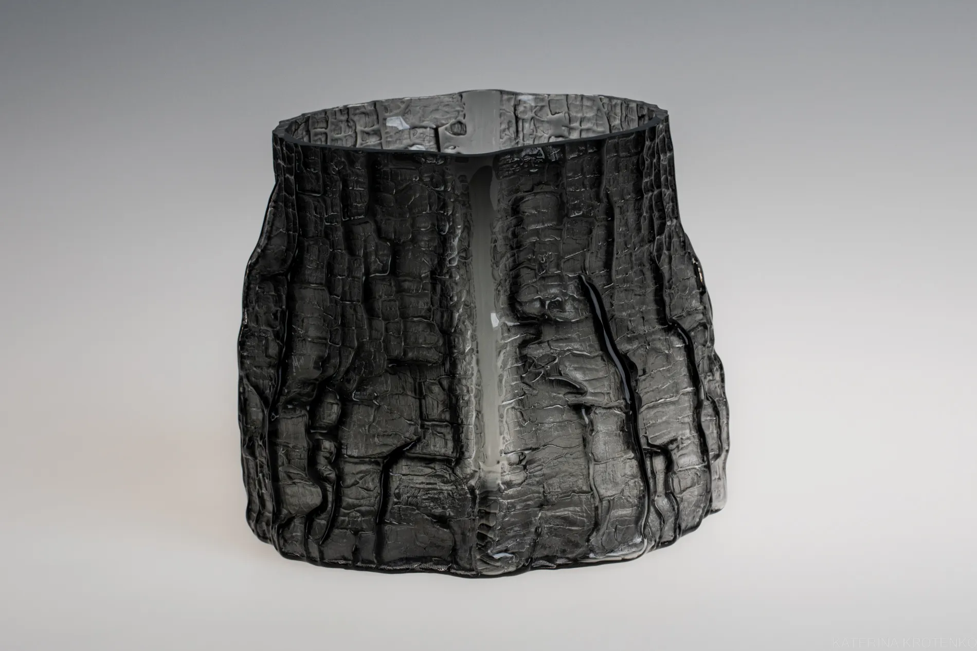 The wooden mould changes continuously during the glass blowing process and eventually burns down. Thus, each mould makes a limited edition of unique pieces. A sequence number is assigned to each piece, and due to the design and the technique, each object is one of a kind, and its shape, texture, dimensions, and weight differ, as if it would be grown from the earth. Moulds for glassblowing are made out of up-cycled local timber consciously selected by the designer to achieve a variety of structures.