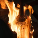The making process is a captivating synergy of elements — the tiniest details of a momentary structure of burning wood are captured with molten hot glass, continuously changing shape.