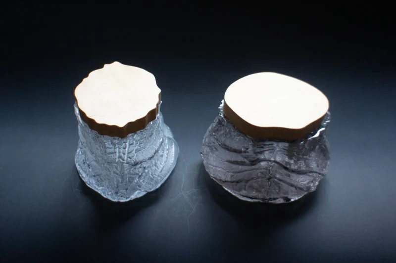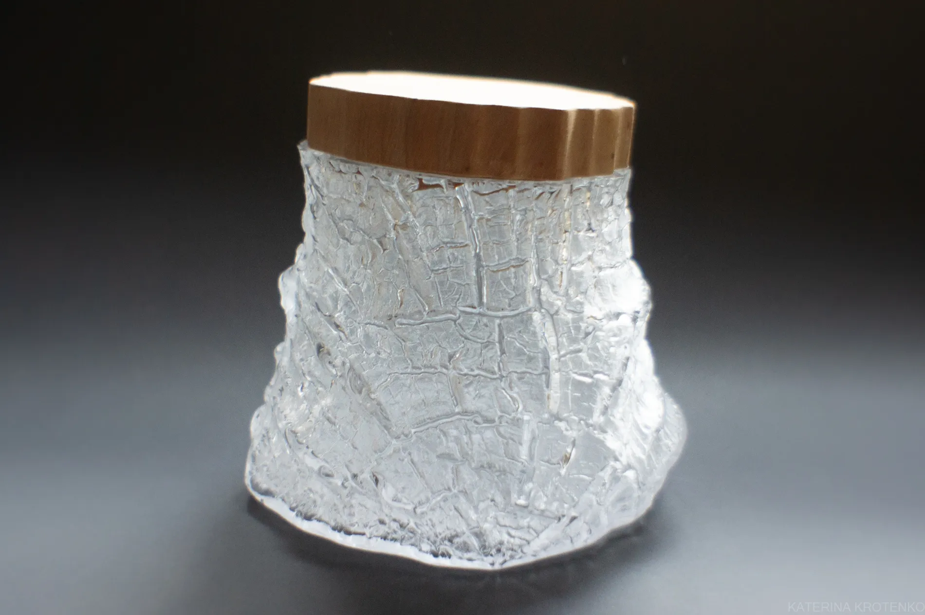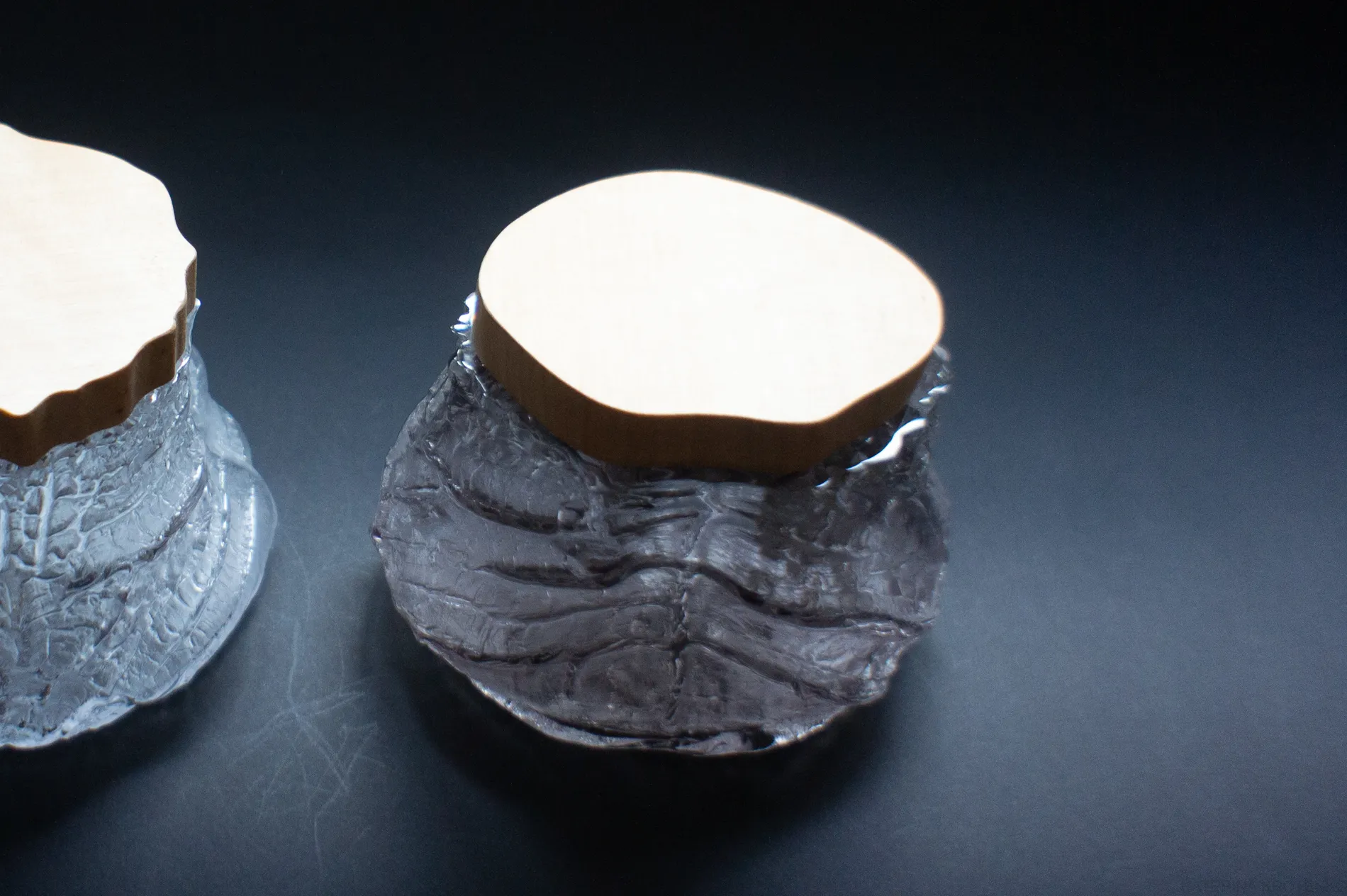 Wood working and mould making, glass hot work and cold work: by the designer herself. Hot work, mouth blowing into a wooden mould: by the glass master. Moulds for glassblowing are made out of up-cycled local timber. The wood for the moulds is consciously selected by the designer to achieve a variety of structures. Hand-drawn shapes transformed with digital graphic tools and produced with industrial CNC machine.The shapes of the wooden lids are first hand-drawn, then fine-tuned in vector curves that are next transformed into 3D shapes and milled with a CNC machine from scrap wood material left after making glass moulds, and finally sanded and coated with wax. Each wooden lid is a unique pair to each unique glass piece, no shape is the same.