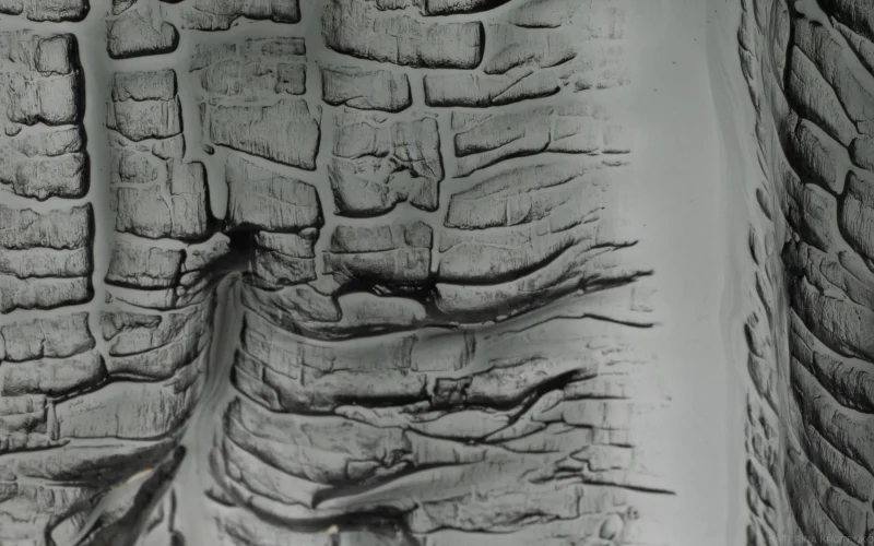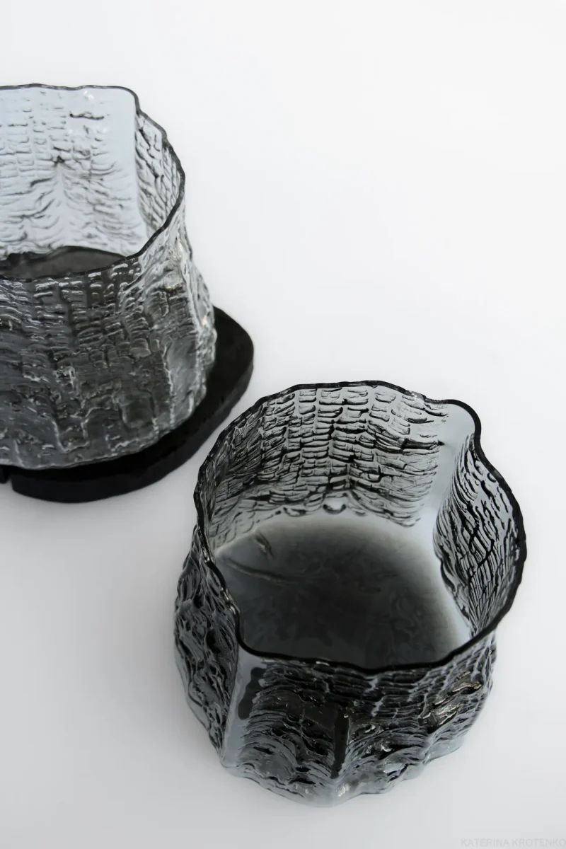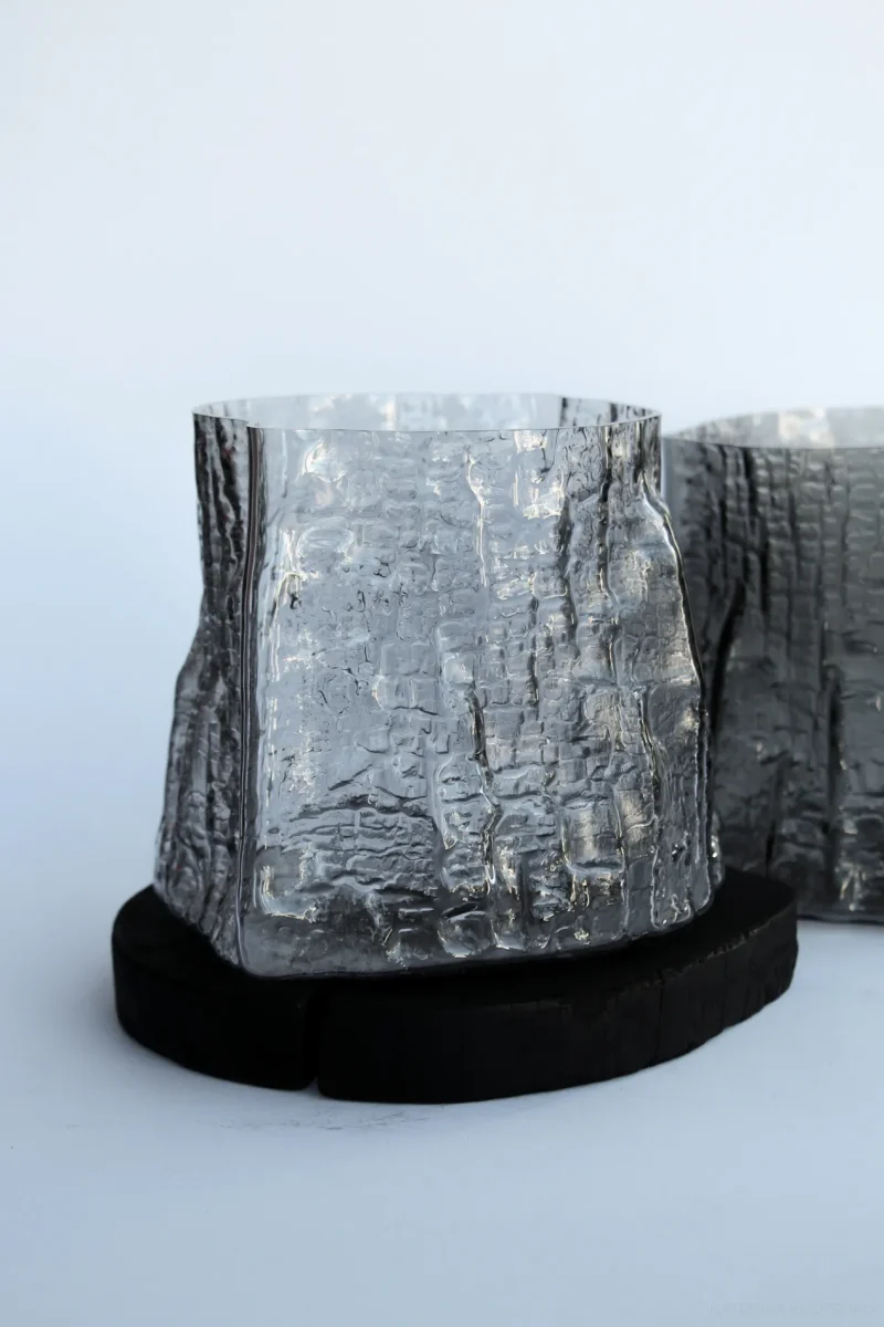 The wooden mould changes continuously during the glass blowing process and eventually burns down. Thus, each mould makes a limited edition of unique pieces. A sequence number is assigned to each piece, and due to the design and the technique, each object is one of a kind, and its shape, texture, dimensions, and weight differ, as if it would be grown from the earth. Moulds for glassblowing are made out of up-cycled local timber consciously selected by the designer to achieve a variety of structures.