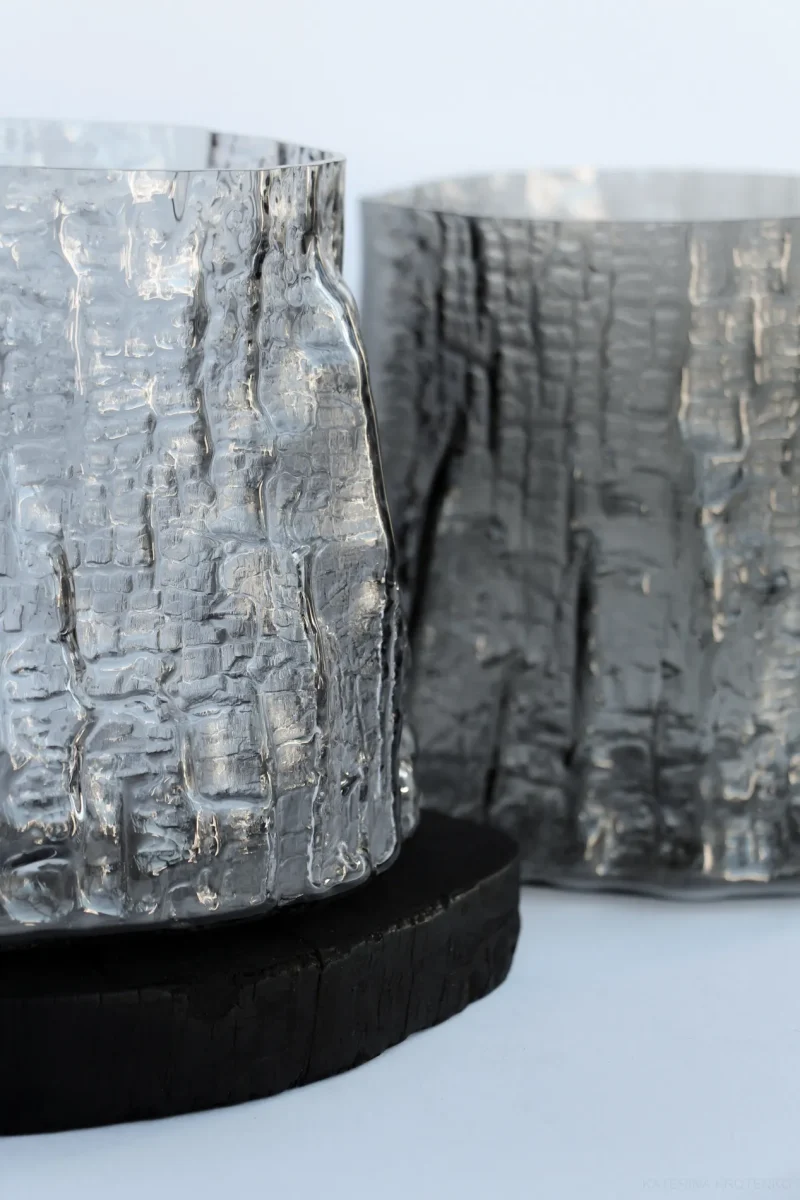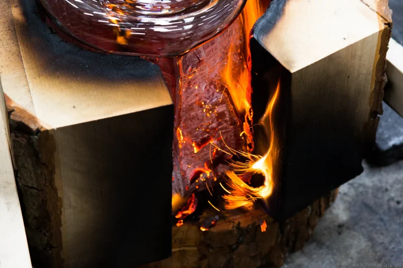The making process is a captivating synergy of elements — the tiniest details of a momentary structure of burning wood are captured with molten hot glass, continuously changing shape.