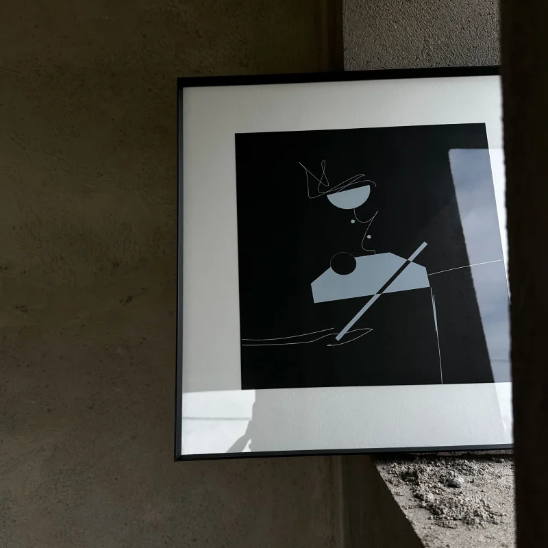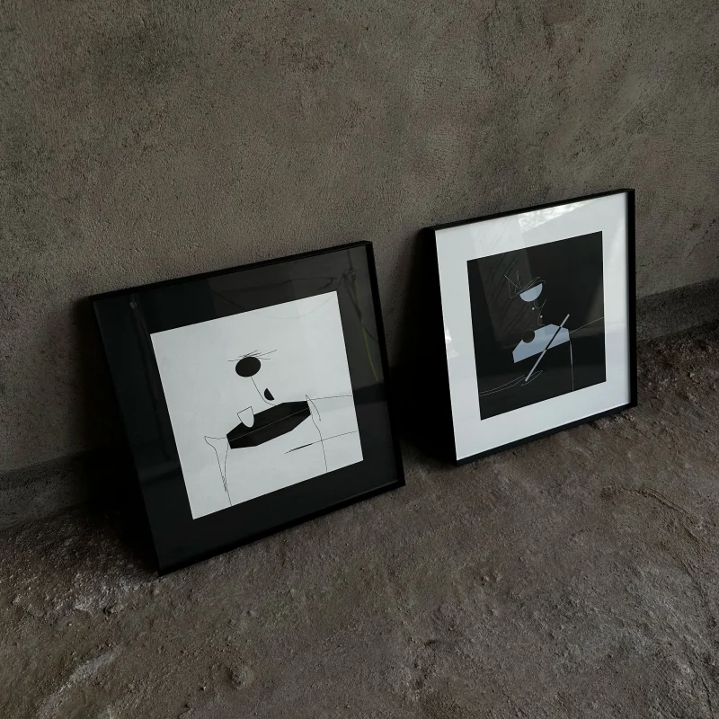 “Shibui Dialogue” is a pair of screen-printed artworks on uncoated coloured paper, presented in a striking black and white palette. These pieces serve as a visual ode to WANNAS’s Shibui sculptures, capturing the understated beauty inherent in the sculptural process. The scribbled forms reflect a raw and spontaneous vision, embodying the subtle elegance of creation.