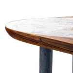 The Shilpa Meja table by sāar is a sophisticated blend of Danish Modern influences and Scandinavian artistry. Its design showcases a seamless fusion of materials, creating a strikingly dramatic yet harmonious tabletop. The organic, softly curved edges exude a sense of fluidity and refinement, while the legs appear as an uninterrupted extension of force and elegance.