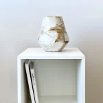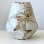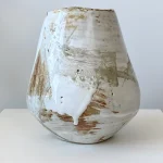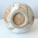 This vase by Elena Yakimushkina combines a simple, organic shape with the raw beauty of natural materials. Its warm, earthy tones – a mix of soft whites, beige, and warm browns – are highlighted by abstract patterns that emerged naturally during the wood-firing process. The interaction between shino and ash glazes created unique textures and marks, making this piece truly unique.