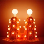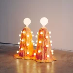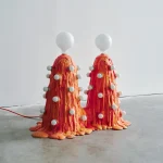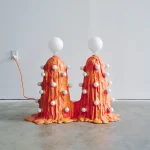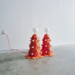 The “Siamese Orange Foam Lamp” is molded in a paper composite, then has expandable foam poured over its surface. Multiple pours create a puddling effect at the bottom of the piece. A series of incandescent bulbs protrude from its sides and it is topped with two large LED bulbs.