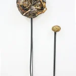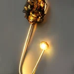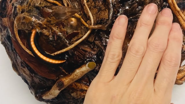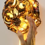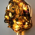 “Sympoietic” by Sabrina Merayo Nuñez delicately interlaces the realms of the human, non-human, and technological, suggesting an intricate kinship. Sabrina has innovatively formulated her own recipe for a 100% biodegradable collagen-based bioplastic, merging modern methods with time-honored medieval techniques traditionally employed for crafting paints and adhesives. With this avant-garde material, she has sculpted lighting masterpieces that engage with viewers, using state-of-the-art motion sensors. These creations seamlessly blend handcrafted elements with artfully repurposed manufactured components, such as intricate carvings, furniture fragments, veneers, and glinting crystals.