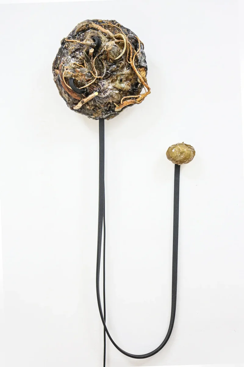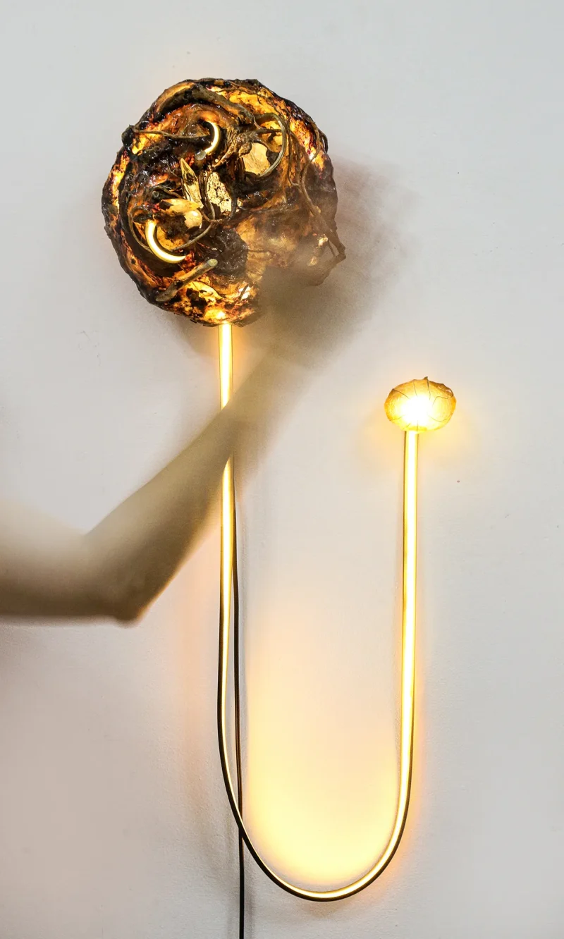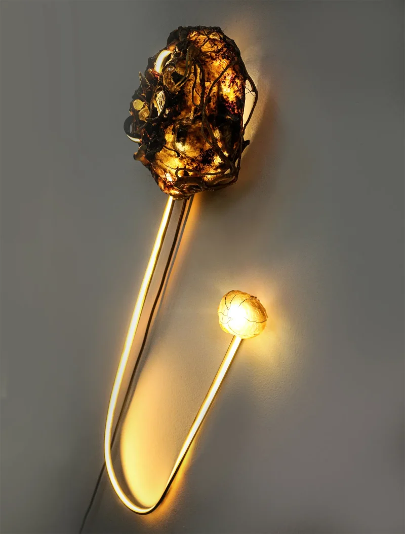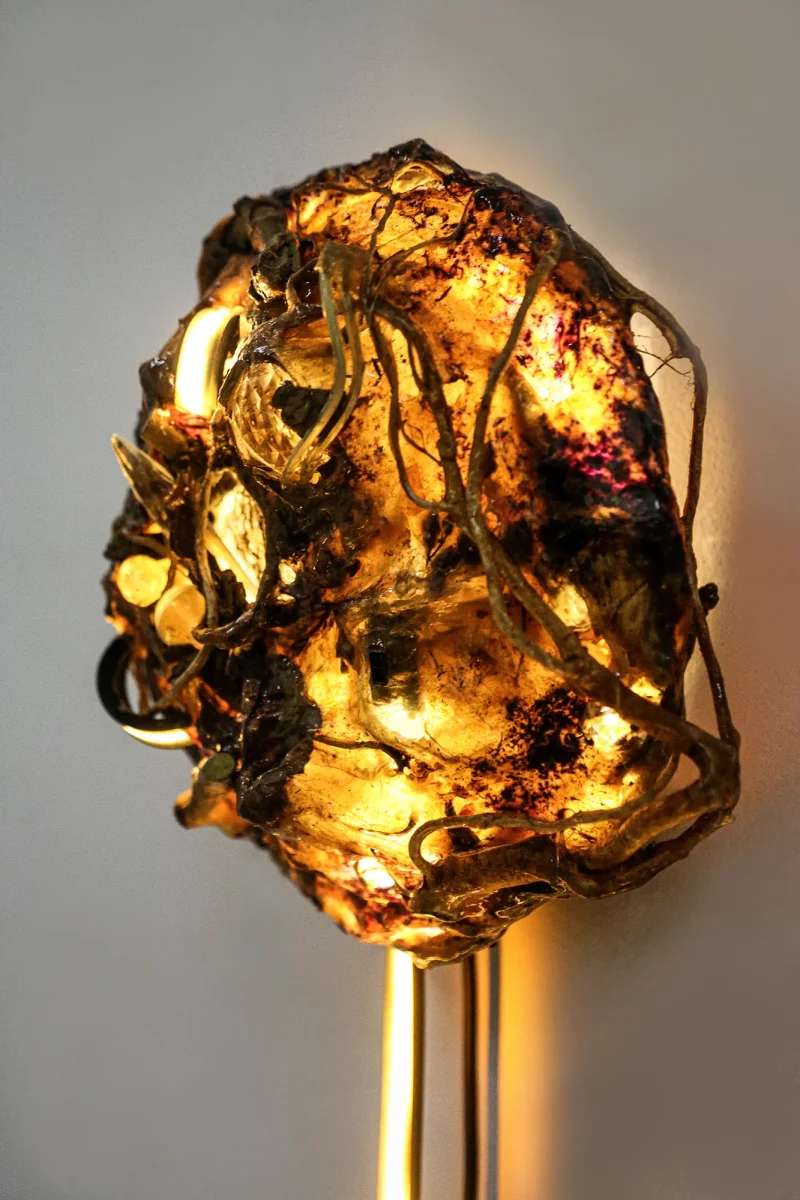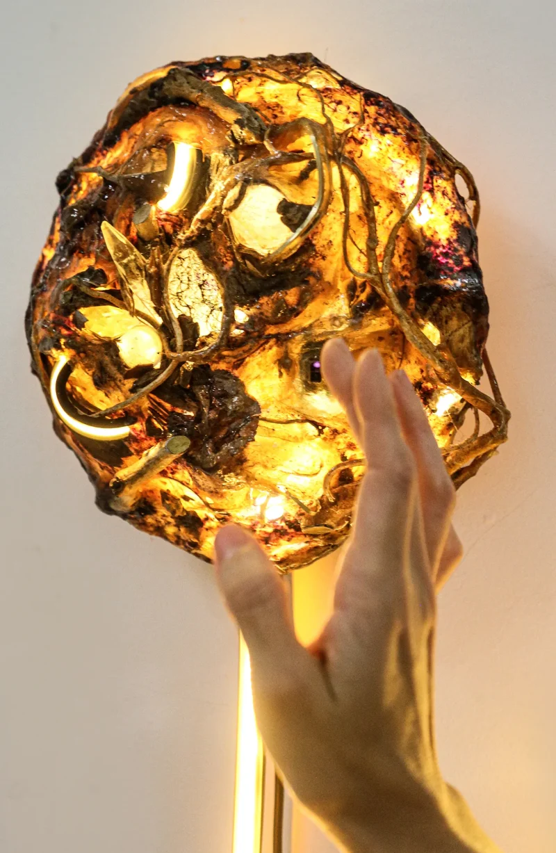 “Sympoietic” by Sabrina Merayo Nuñez delicately interlaces the realms of the human, non-human, and technological, suggesting an intricate kinship. Sabrina has innovatively formulated her own recipe for a 100% biodegradable collagen-based bioplastic, merging modern methods with time-honored medieval techniques traditionally employed for crafting paints and adhesives. With this avant-garde material, she has sculpted lighting masterpieces that engage with viewers, using state-of-the-art motion sensors. These creations seamlessly blend handcrafted elements with artfully repurposed manufactured components, such as intricate carvings, furniture fragments, veneers, and glinting crystals.