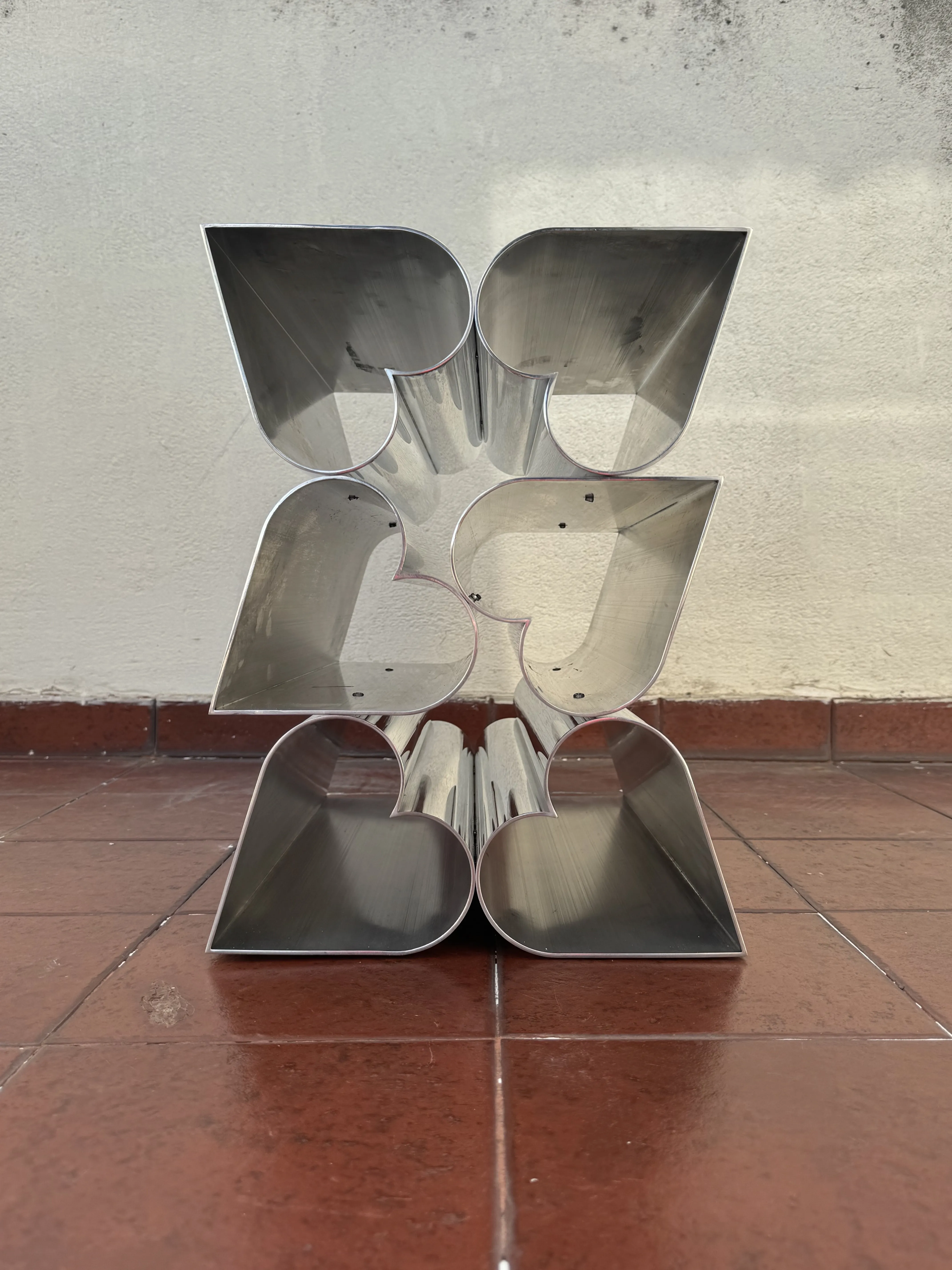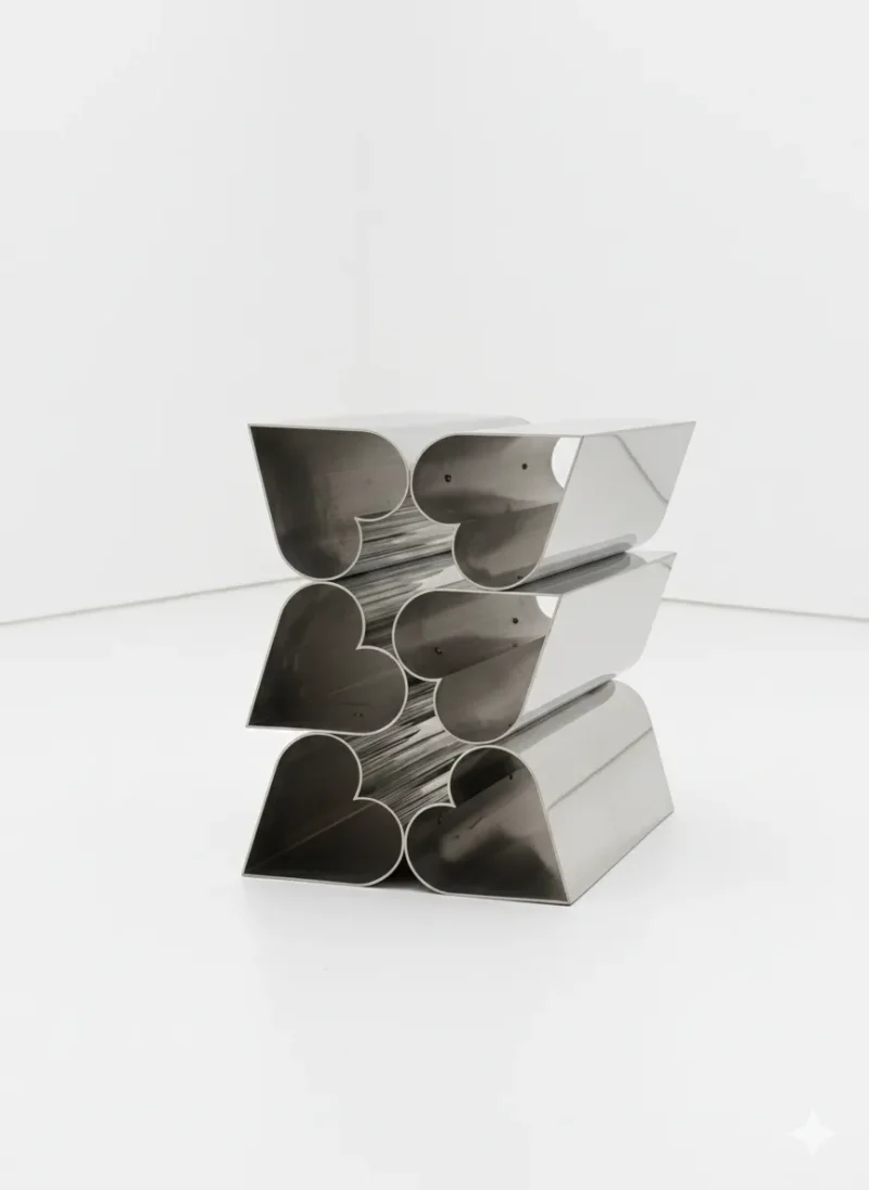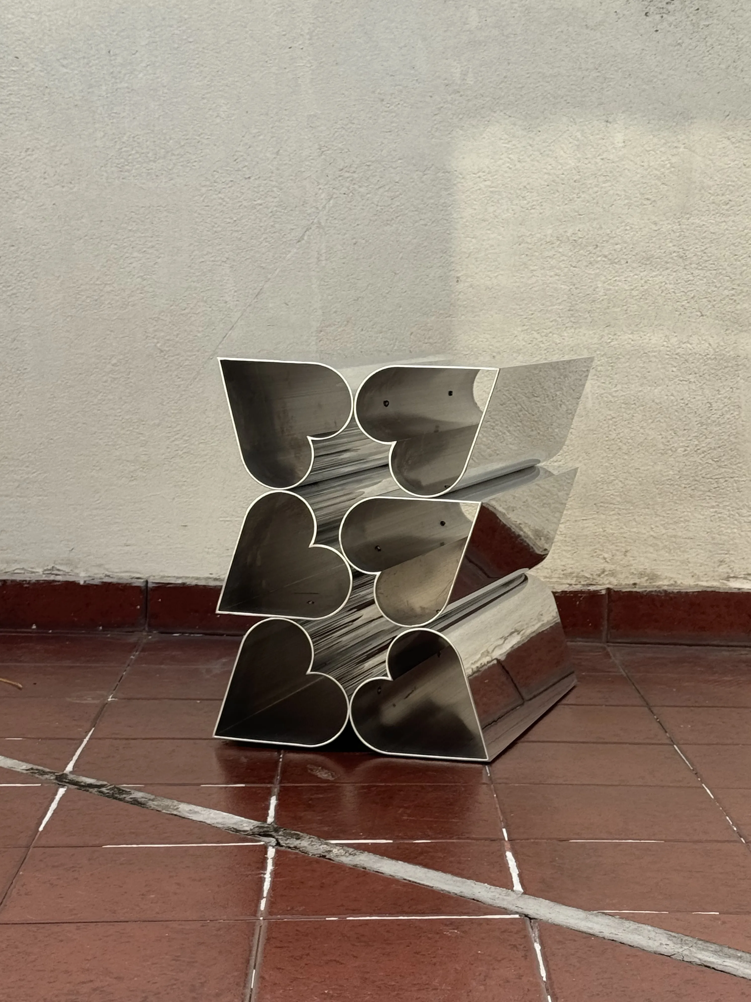 Side Piece is part of Deon Rubi’s ongoing investigation into industrial processes as carriers of emotional meaning. Built from her custom heart-shaped extruded aluminum tubes and solid bars, materials she developed exclusively for this body of work, the piece embeds symbolic form directly into its structure. By using a standardized industrial process to produce a material “made with love,” Rubi blurs the line between functional object and sculptural gesture. Side Piece is the latest iteration in this series and its intended to be used as a side table.