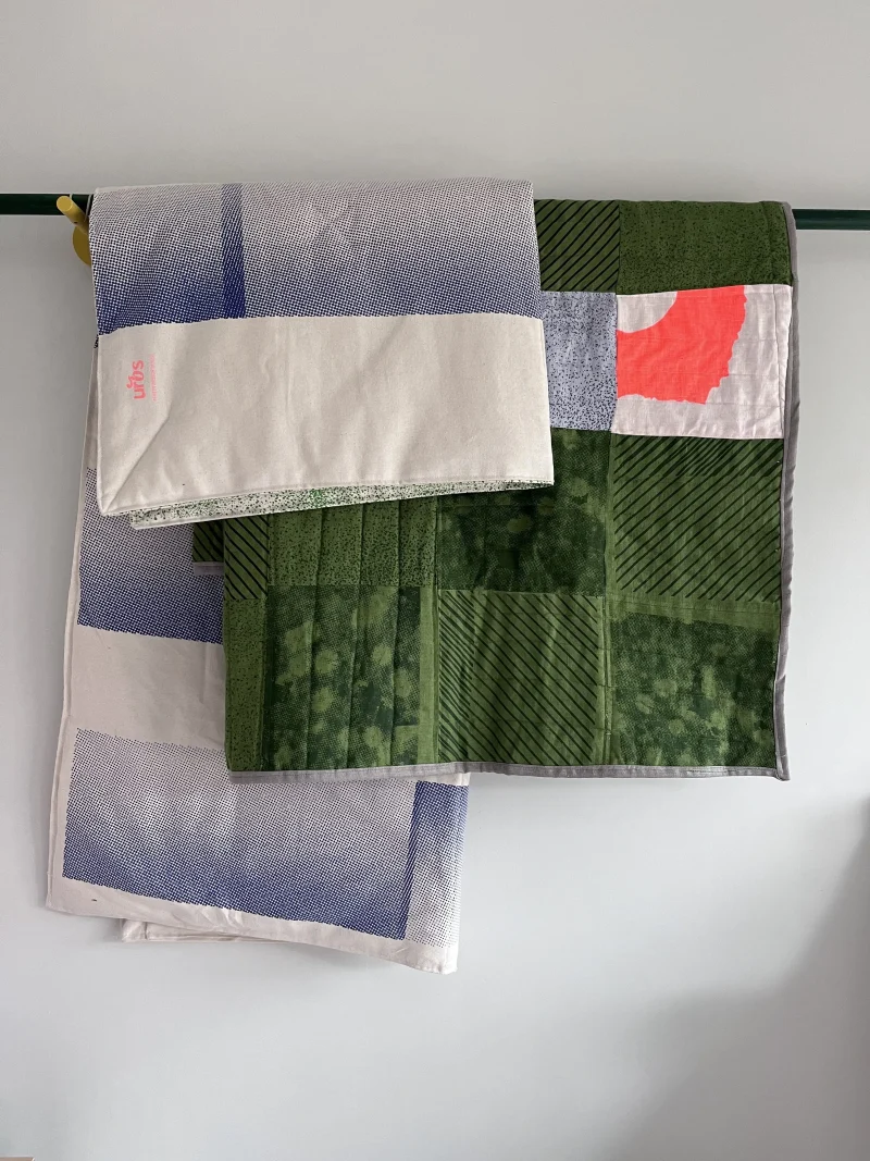 100% linen fabrics, hand printed and sewn in our studio. The piece is a one of a kind “throw sized” quilt.