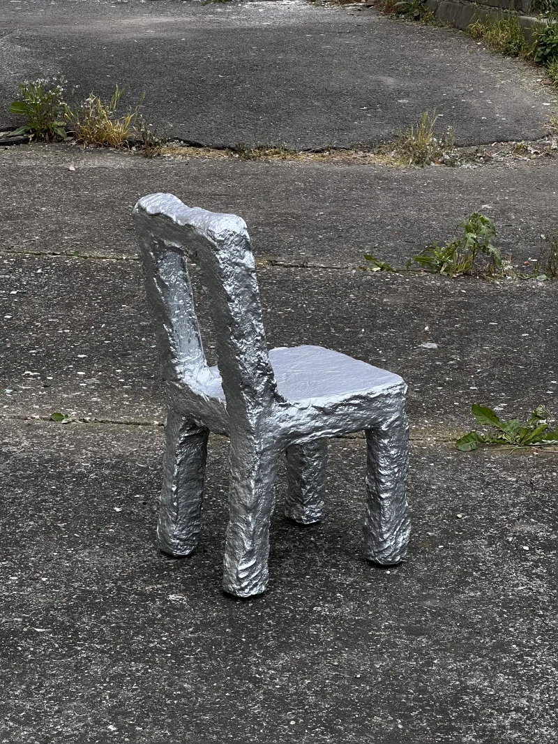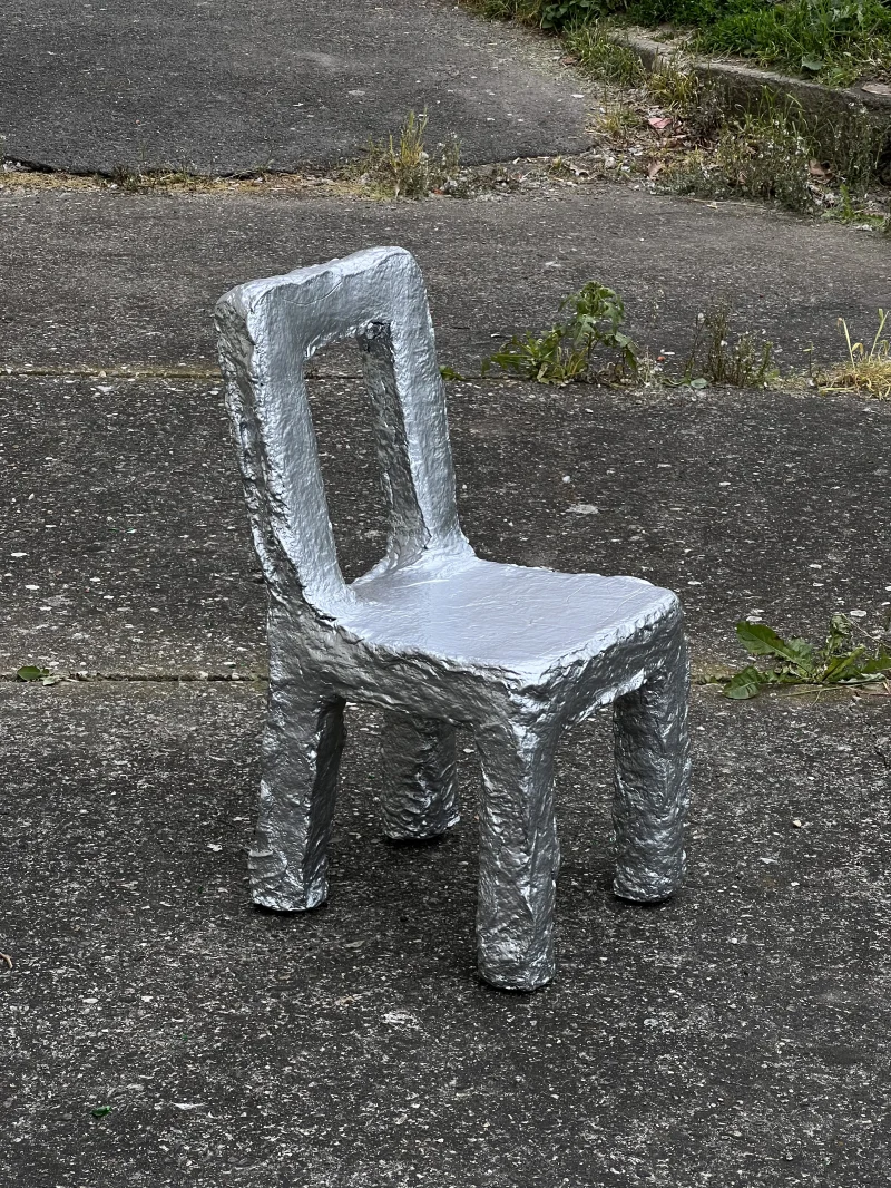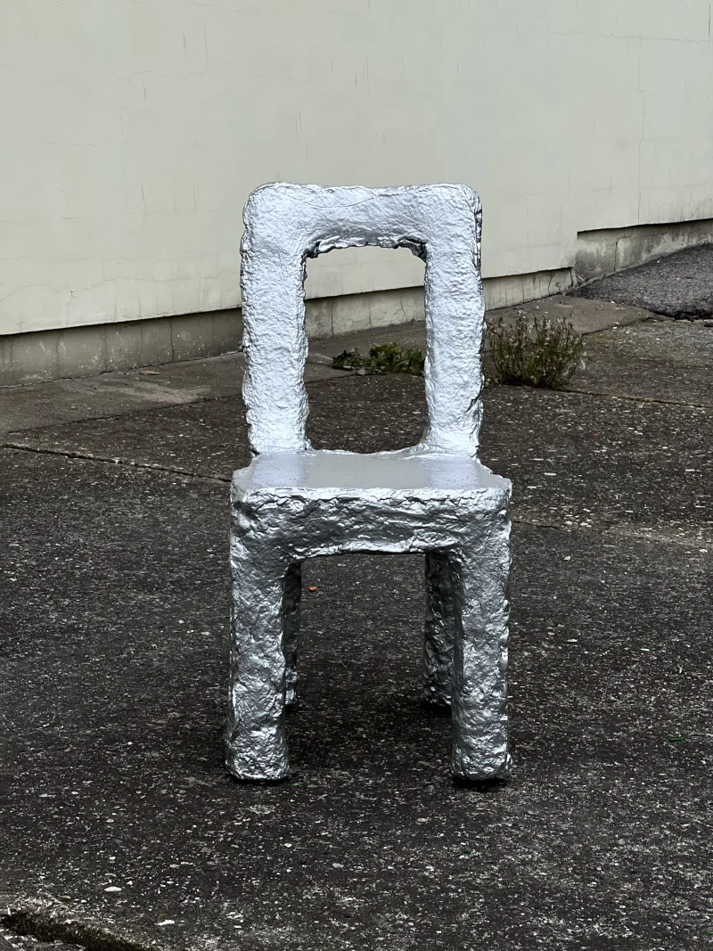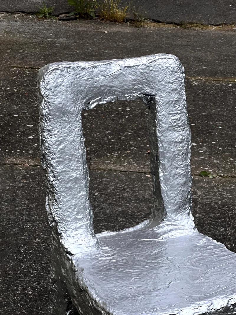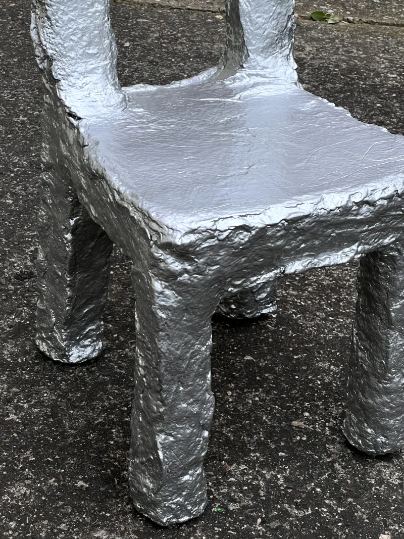 Upcycled, silver, fully functional, handmade chair by David Čáp, with a square shape made of shredded paper. Despite the unconventional material, it has sufficient load capacity (100 kg) and is easy to wash.