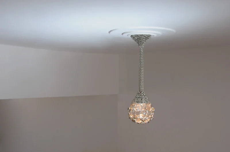 The Single-Pendant Chainmail Droplet Chandelier, a masterpiece by Panorammma, stands as a testament to handcrafted brilliance. A chainmail web delicately embraces the chandelier’s canopy, gradually forming a tightly knit rope that gracefully suspends a glass globe. Behind this intricate chainmail veil, a warm light source remains concealed, casting a mesmerizing glow. The Chainmail Droplet Chandelier embodies a captivating paradox between material and form, assuming an organic cocoon-like appearance.