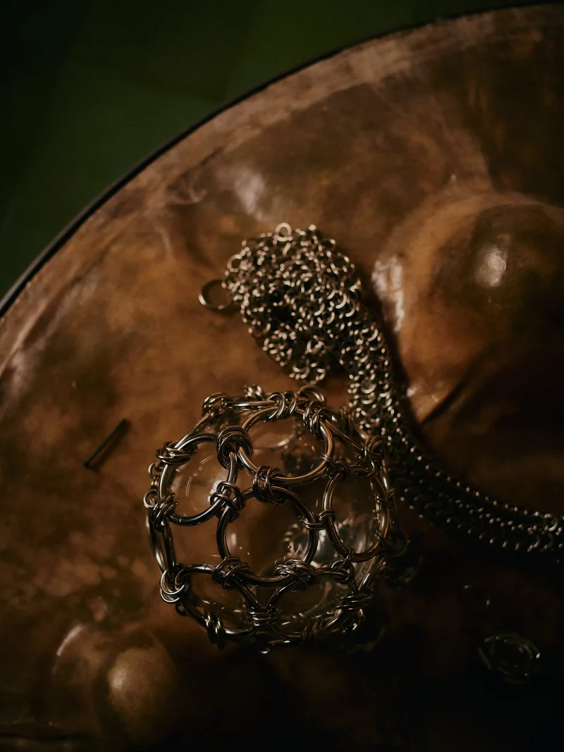 Chainmail, a material laden with historical significance, signifies both grandeur and victory, as well as violence. Initially devised for protective armor, it has transcended into the realms of jewelry, punctuations, restraint, bondage, and discipline. It exemplifies an ancient craft that paradoxically exudes an industrial and modern aesthetic. With this pendant, Panorammma aspired to fashion an object that melds industrial materials into a gentle luminescent sanctuary.