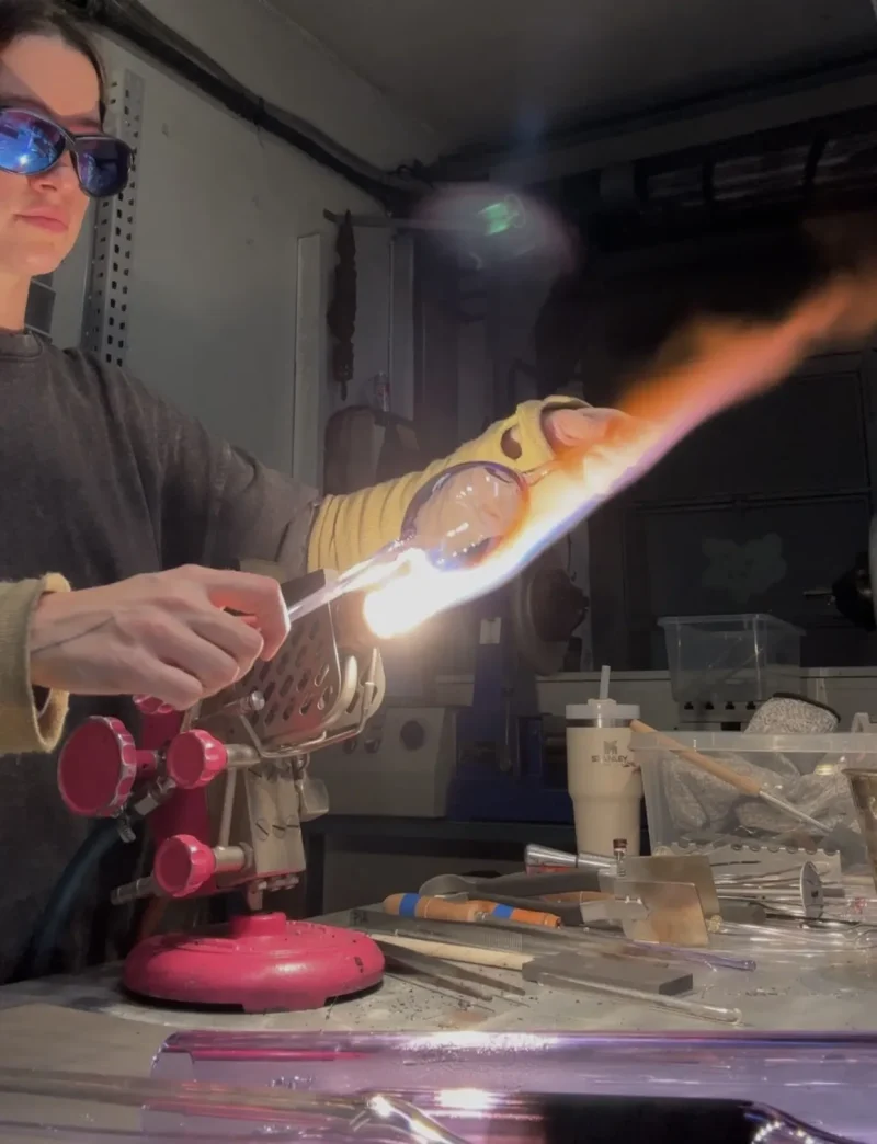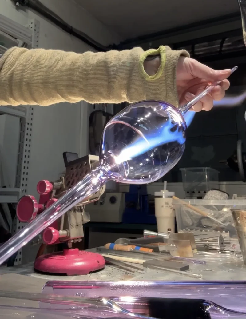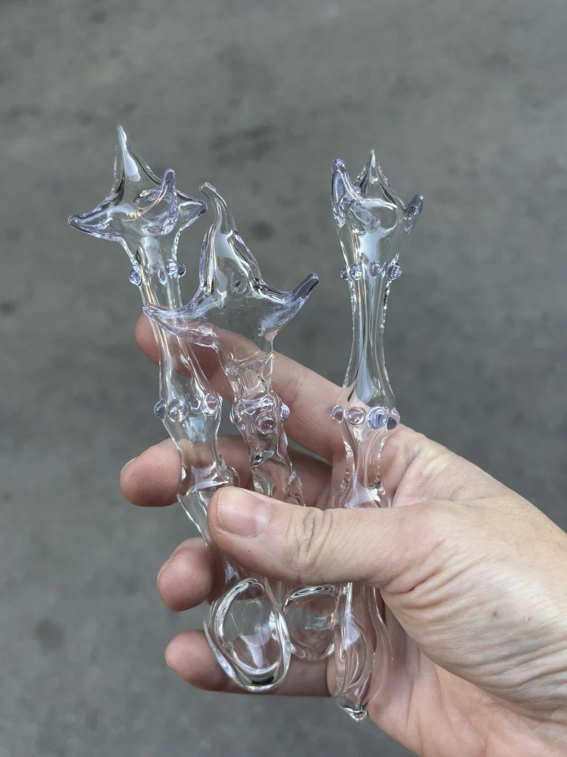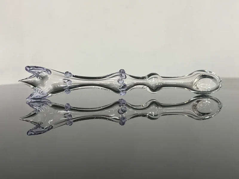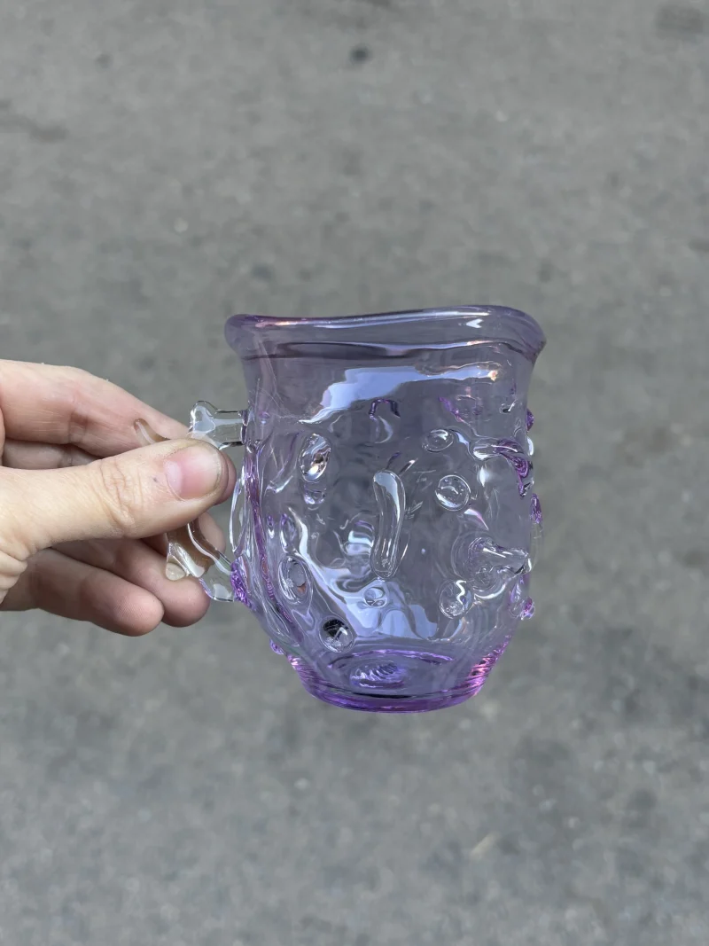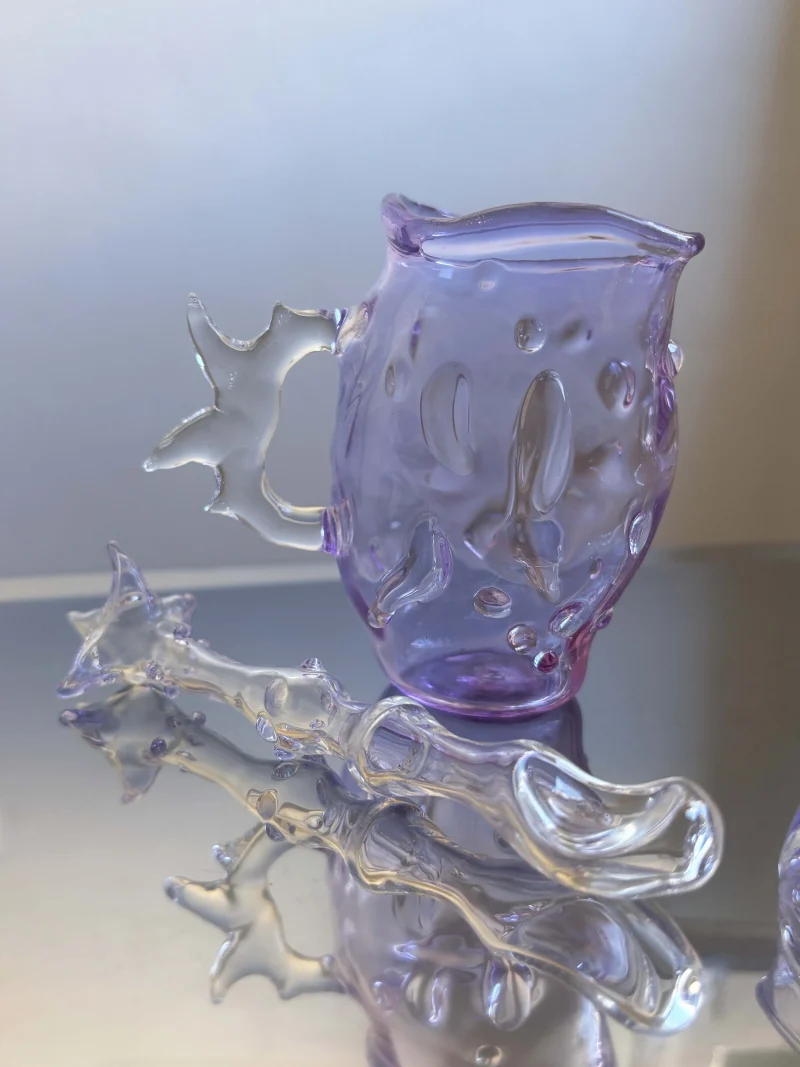 Made with Borosilicate glass using the glass blowing technique. Transparent lilac and clear glass.